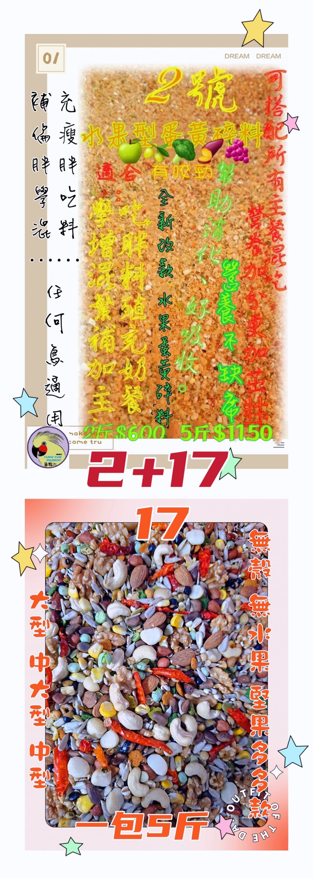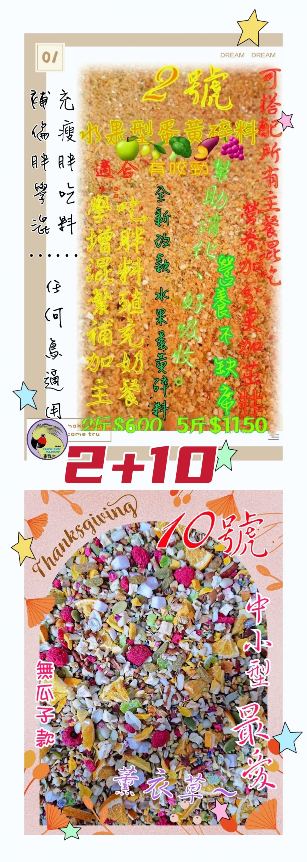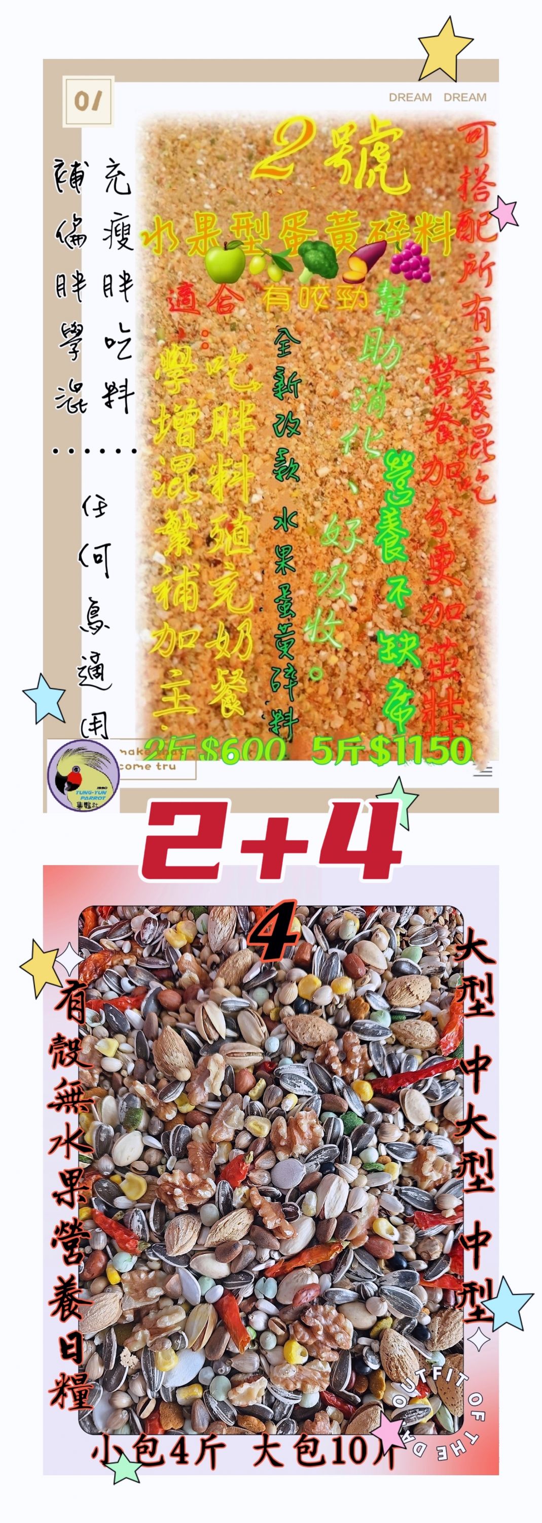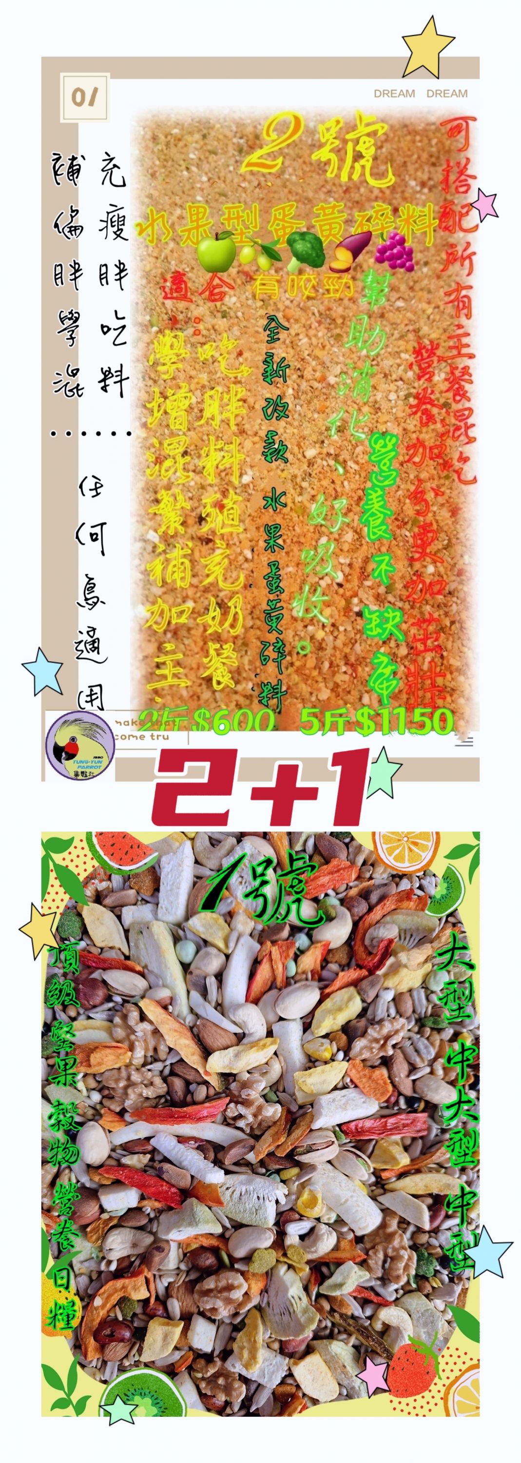 (2號)碎料它是一種用途廣泛的飼料,(非繁殖期@繁殖期都可以使用)繁殖期吃可促進繁殖慾望,補充營養,可吃出羽毛鮮豔、體力增強、長出肉肉、也可以當主食用、(非繁殖期也都可以使用、可以補充強壯,肌肉結實,挑食剋星,增胖胖,同時也可以混賣場無殼飼料一起食用效果極佳(有在用湯匙泡牛奶餵幼鳥的話你可以在加工磨細一點一併加入鸚鵡牛奶混合使用營養加分、成長茁壯)在幼鳥黃金時期或是成鳥時用來補助營養。效果很好,如果你的成鳥還有在餵奶的話,也可以加入一併鸚鵡牛奶餵食需要在磨細一點 (幼鳥、成鳥)都皆可、幼鳥可以幫助發育強壯💪、成鳥可以補充營養、繁殖可以幫助體力不軟腳、放飛鳥補充體力增強抵抗力、斷奶黃金期者極佳選擇。好消化,好吸收...