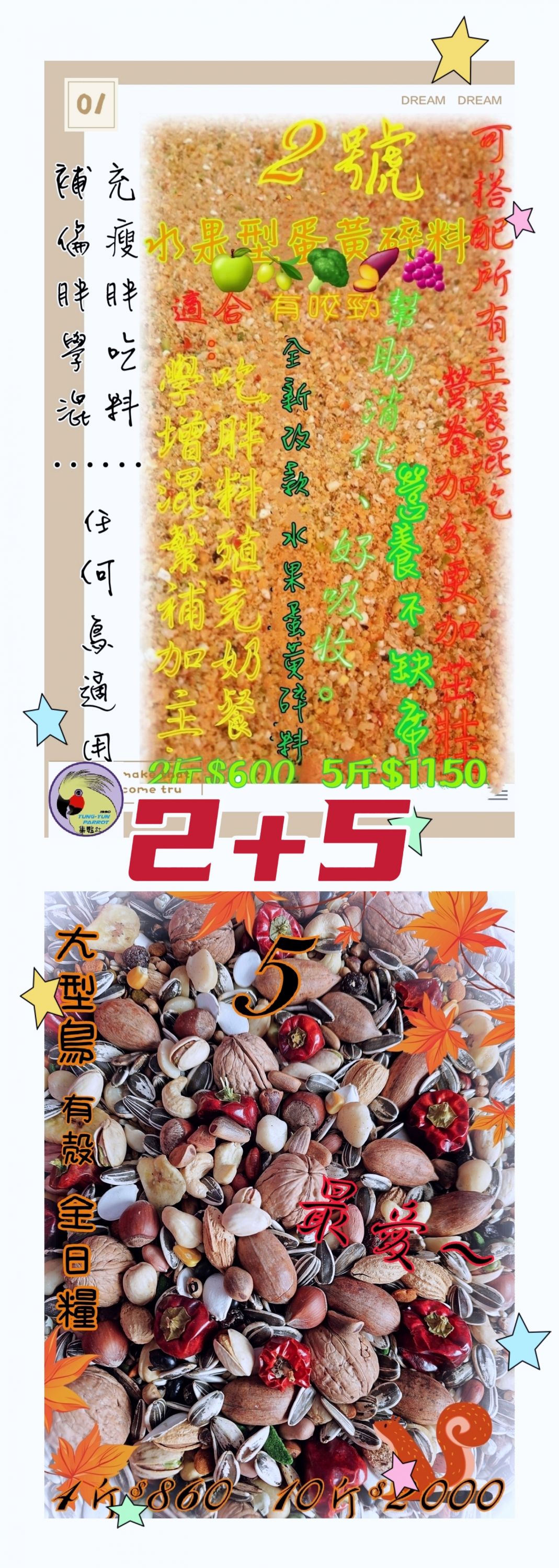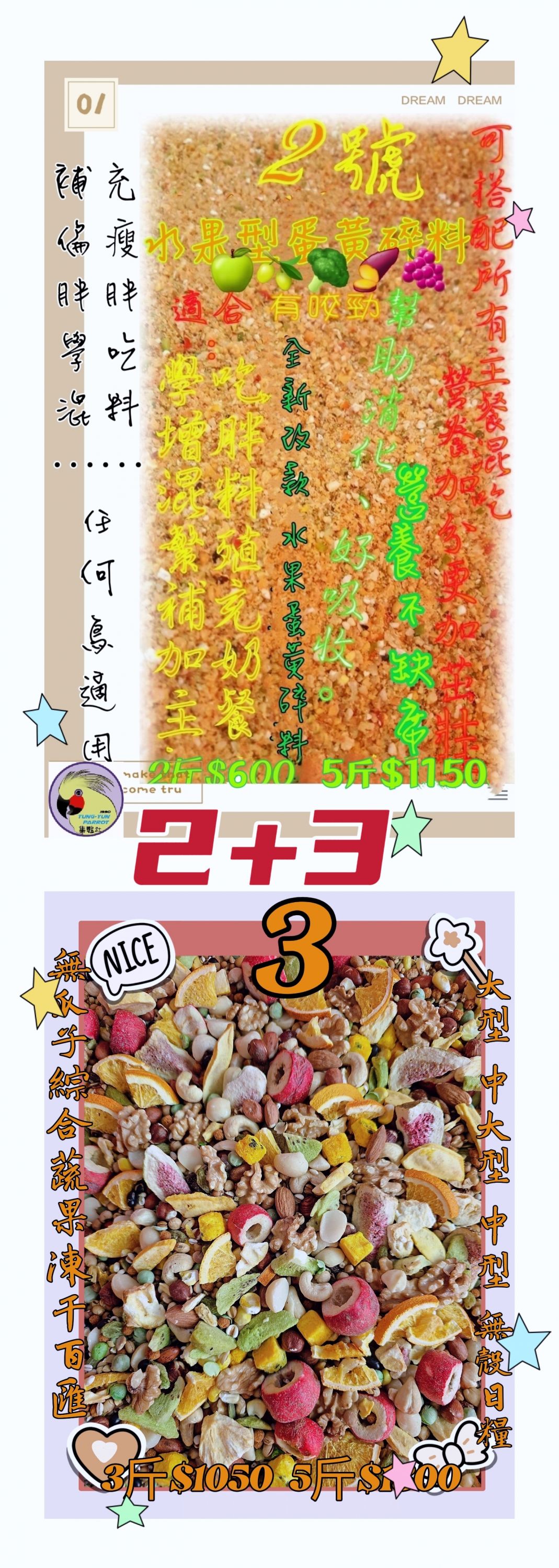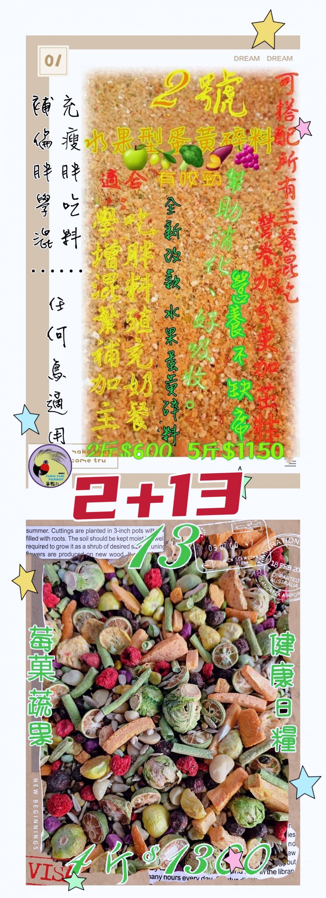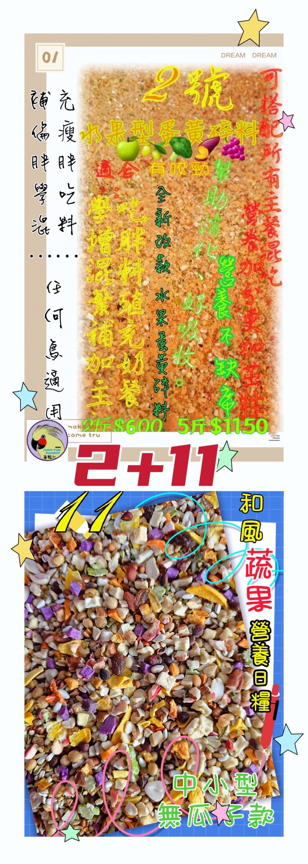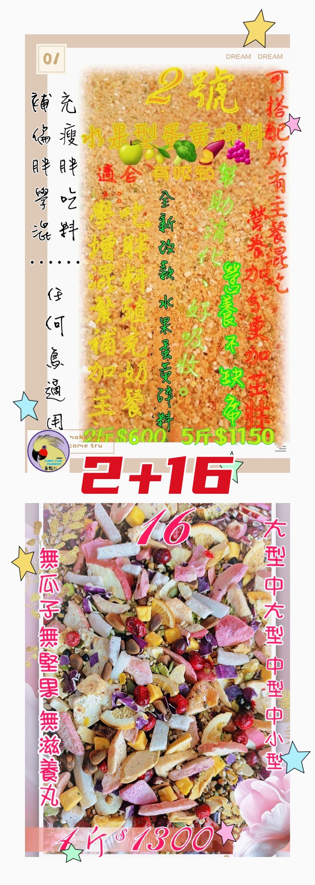 (2號)碎料它是一種用途廣泛的飼料,(非繁殖期@繁殖期都可以使用)繁殖期吃可促進繁殖慾望,補充營養,可吃出羽毛鮮豔、體力增強、長出肉肉、也可以當主食用、(非繁殖期也都可以使用、可以補充強壯,肌肉結實,挑食剋星,增胖胖,同時也可以混賣場無殼飼料一起食用效果極佳(有在用湯匙泡牛奶餵幼鳥的話你可以在加工磨細一點一併加入鸚鵡牛奶混合使用營養加分、成長茁壯)在幼鳥黃金時期或是成鳥時用來補助營養。效果很好,如果你的成鳥還有在餵奶的話,也可以加入一併鸚鵡牛奶餵食需要在磨細一點 (幼鳥、成鳥)都皆可、幼鳥可以幫助發育強壯💪、成鳥可以補充營養、繁殖可以幫助體力不軟腳、放飛鳥補充體力增強抵抗力、斷奶黃金期者極佳選擇。好消化,好吸收...