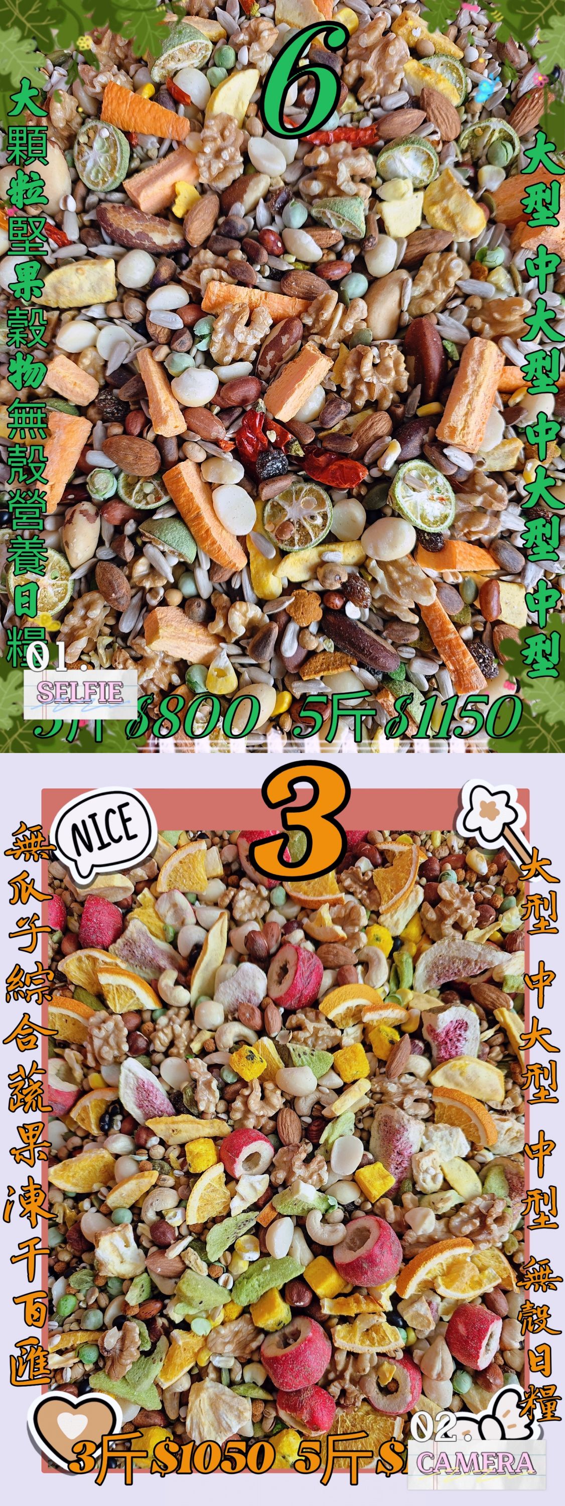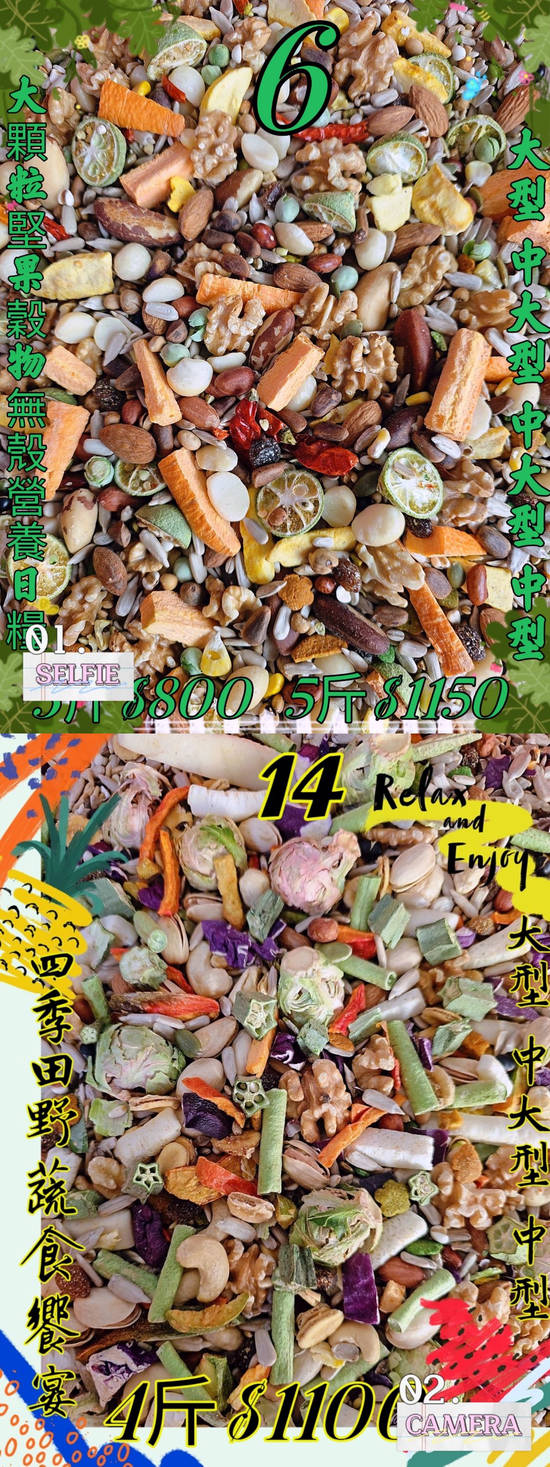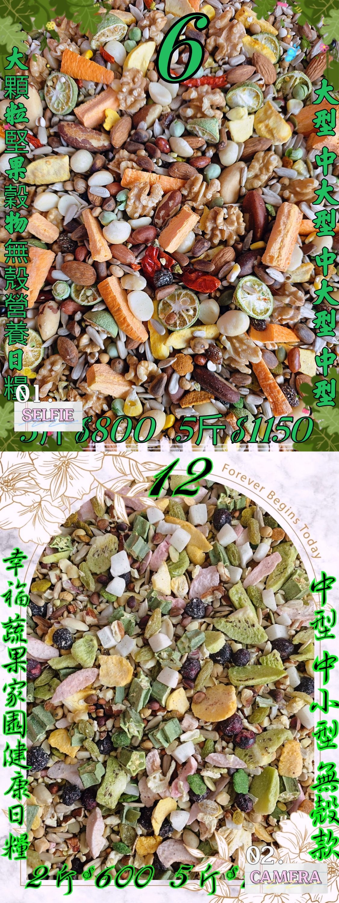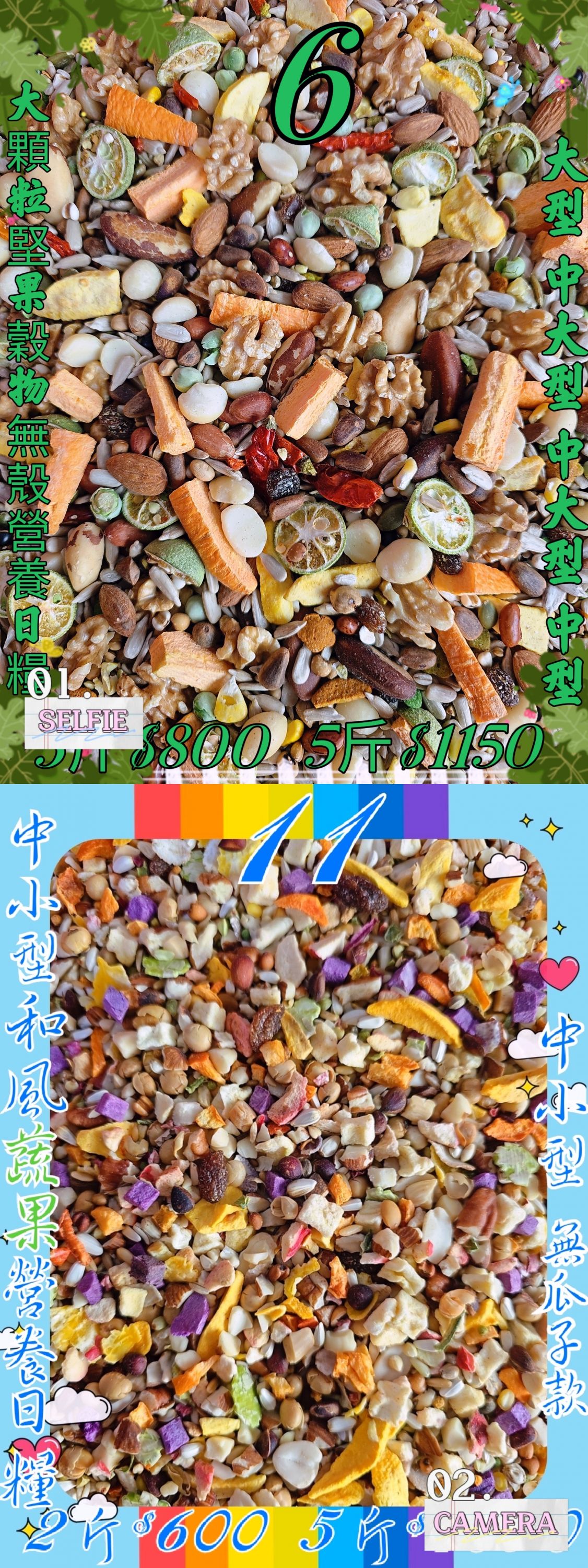 綜合脫殼熟化穀物30幾種、豆類全是爆開使營養更好吸收營養加分(絕沒有高粱.小米.起米.鴿子料🈲️⋯)、高級堅果、(帶殼松子)‘’、巴西堅果、夏威夷豆、核桃仁、杏仁果、野山椒🌶、葡萄乾、紅蘿蔔凍甘條、玉米凍干、青豆凍干、滋養丸、芒果凍干塊、高級青桔凍干…等等🏆 ((也會隨著季節做更新調配))