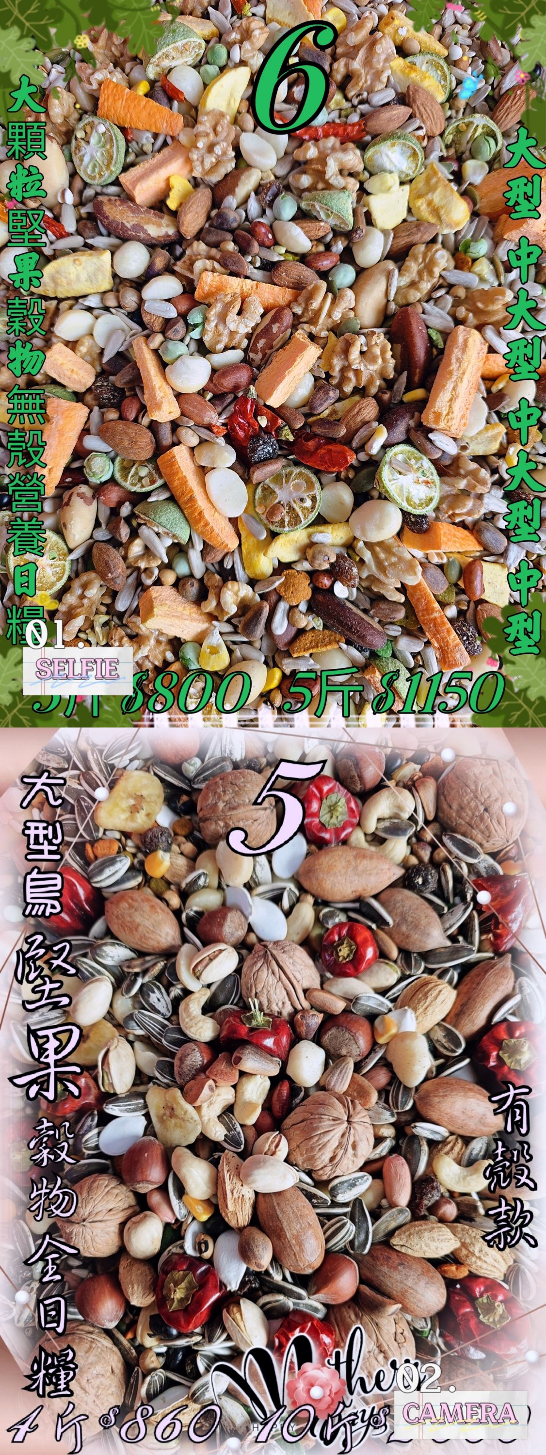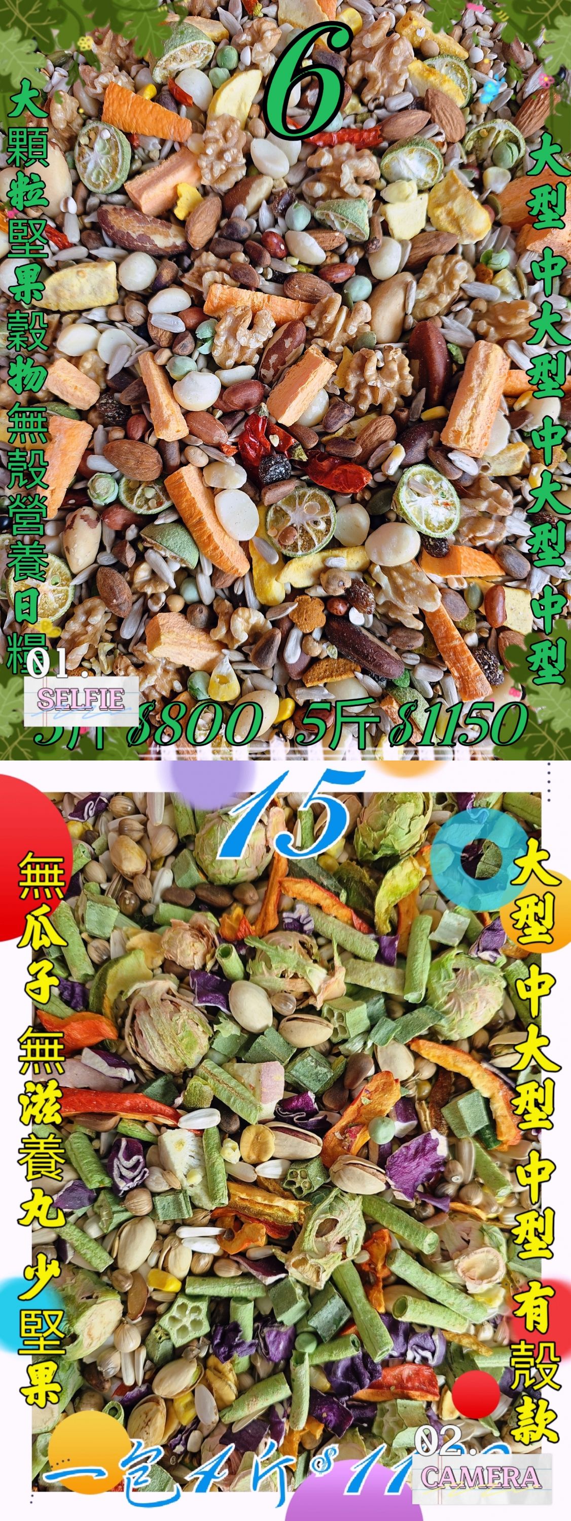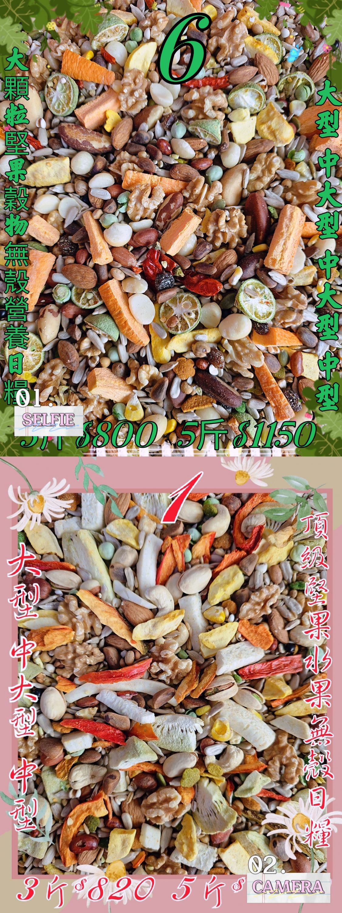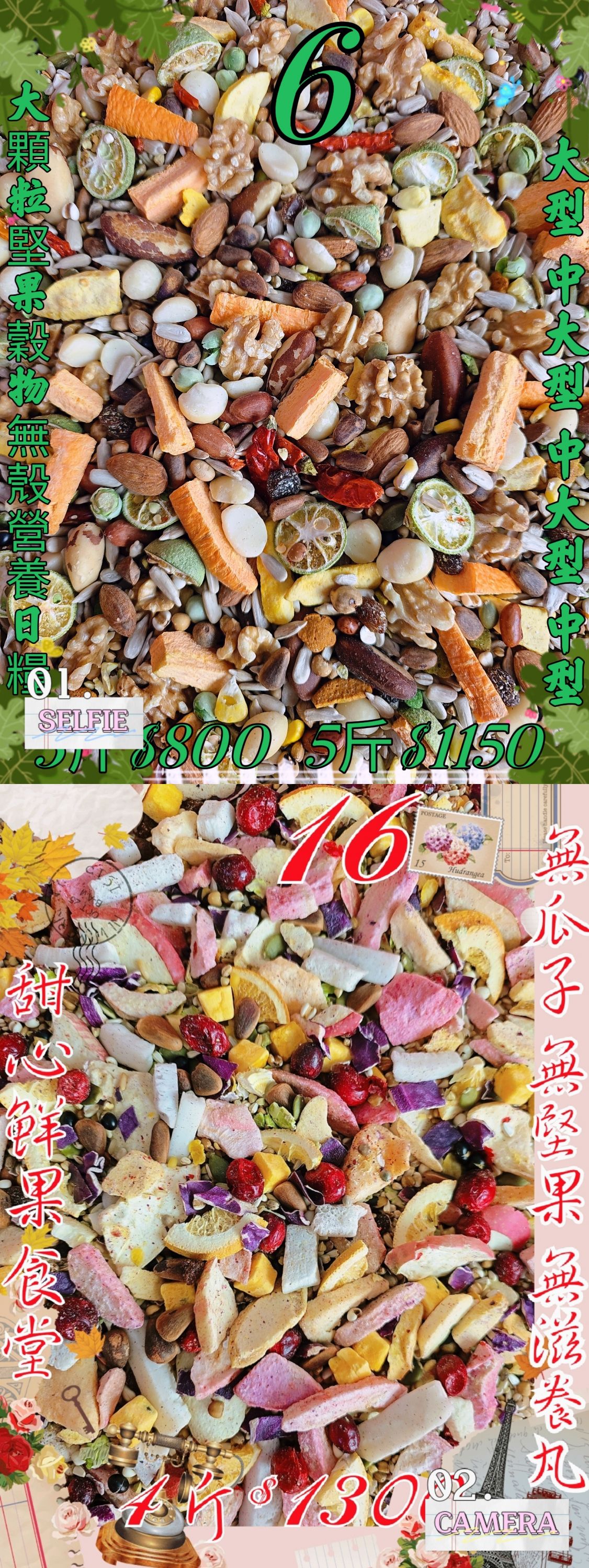 綜合脫殼熟化穀物30幾種、豆類全是爆開使營養更好吸收營養加分(絕沒有高粱.小米.起米.鴿子料🈲️⋯)、高級堅果、(帶殼松子)‘’、巴西堅果、夏威夷豆、核桃仁、杏仁果、野山椒🌶、葡萄乾、紅蘿蔔凍甘條、玉米凍干、青豆凍干、滋養丸、芒果凍干塊、高級青桔凍干…等等🏆 ((也會隨著季節做更新調配))