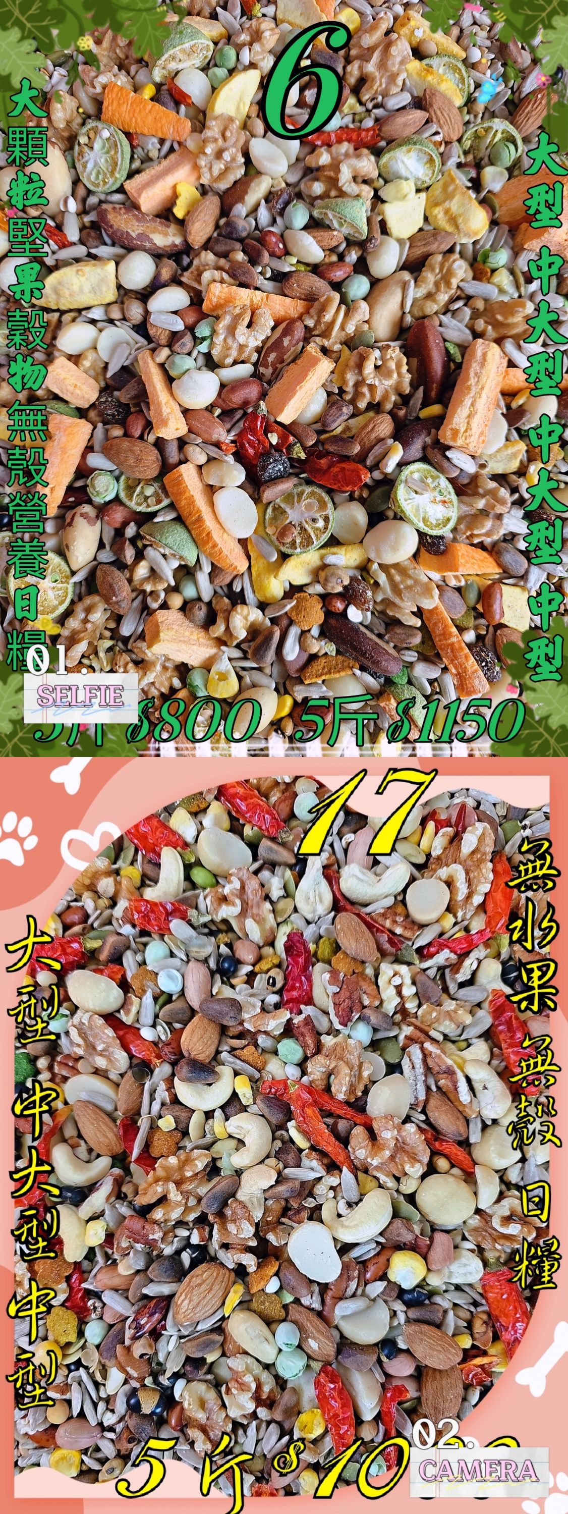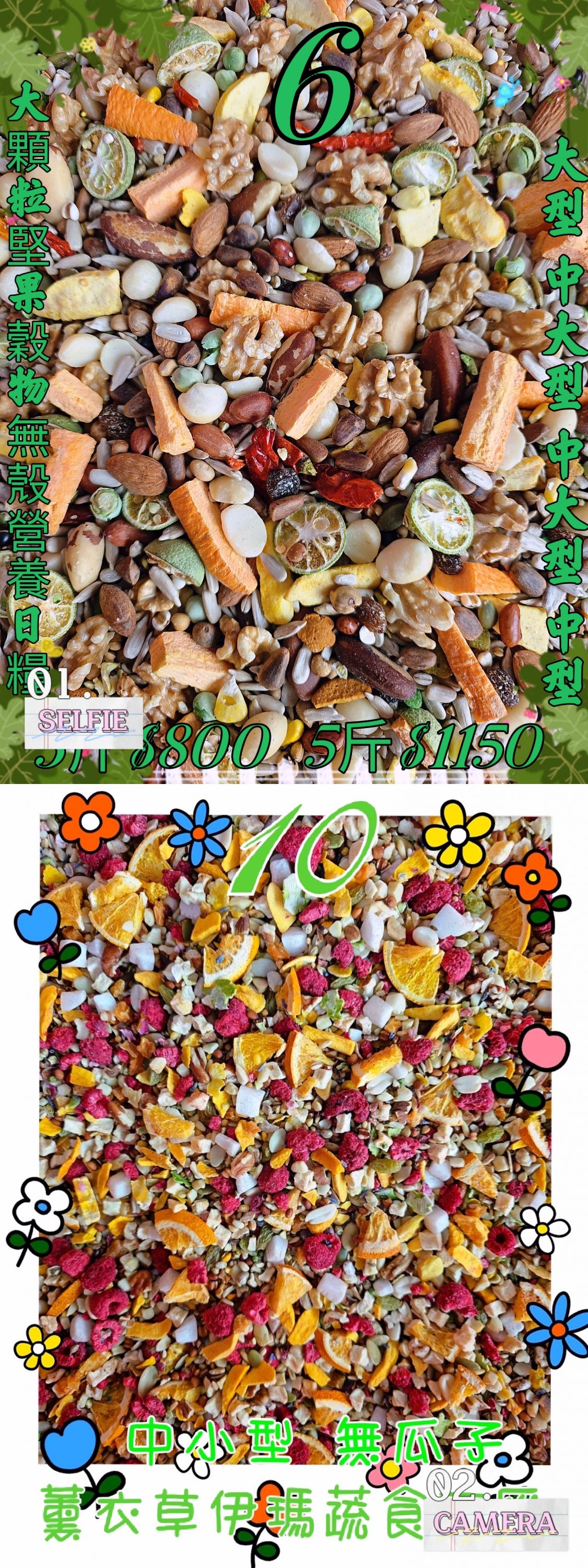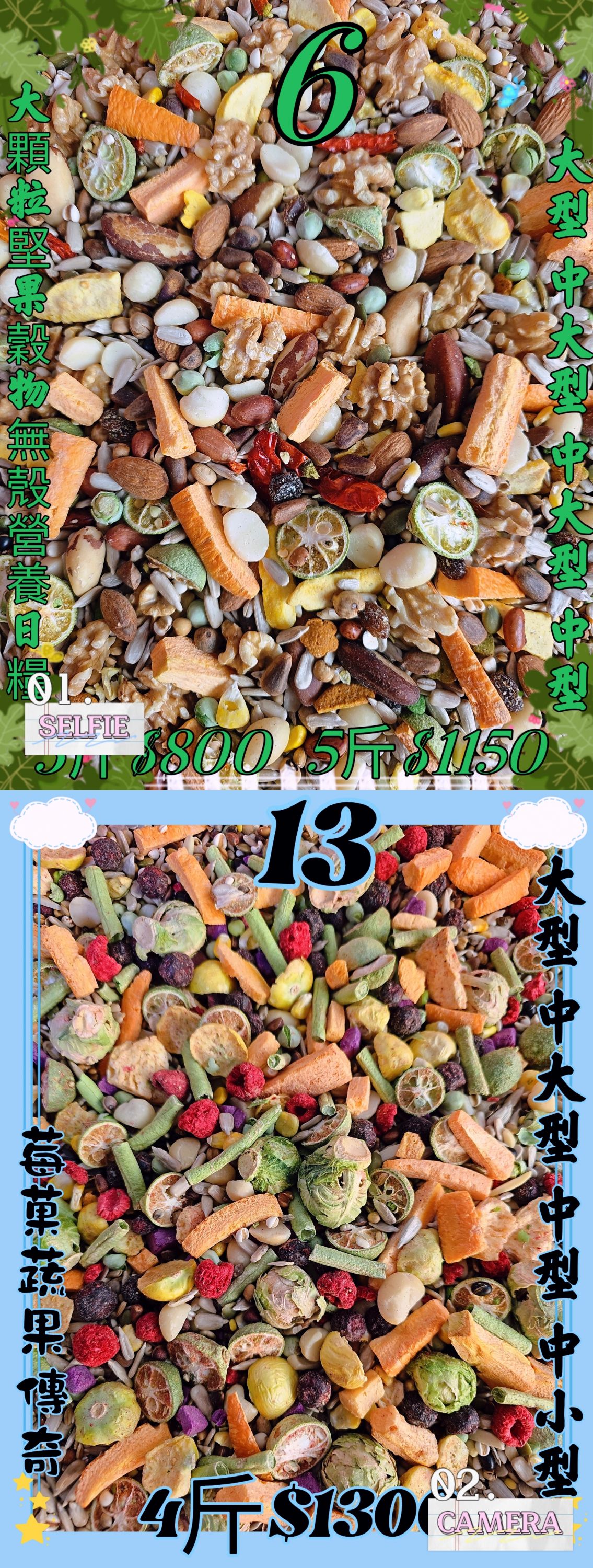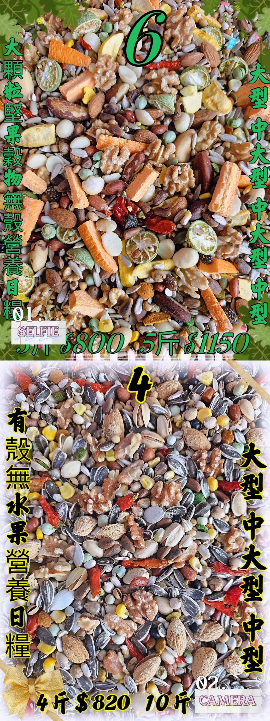 綜合脫殼熟化穀物30幾種、豆類全是爆開使營養更好吸收營養加分(絕沒有高粱.小米.起米.鴿子料🈲️⋯)、高級堅果、(帶殼松子)‘’、巴西堅果、夏威夷豆、核桃仁、杏仁果、野山椒🌶、葡萄乾、紅蘿蔔凍甘條、玉米凍干、青豆凍干、滋養丸、芒果凍干塊、高級青桔凍干…等等🏆 ((也會隨著季節做更新調配))