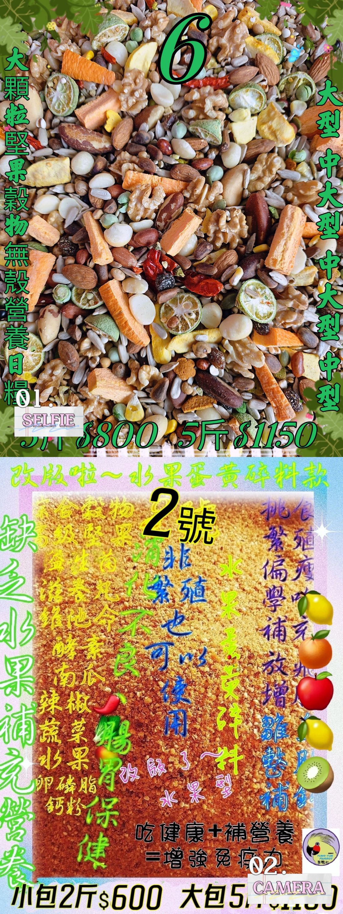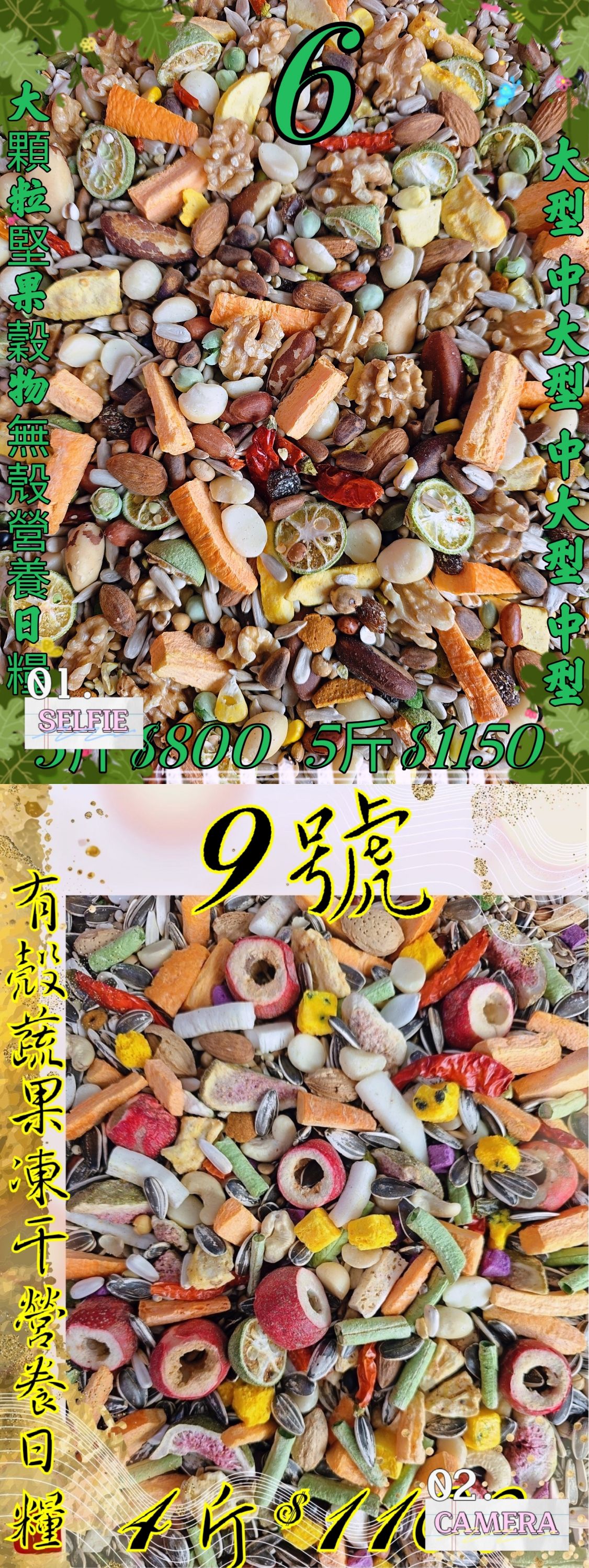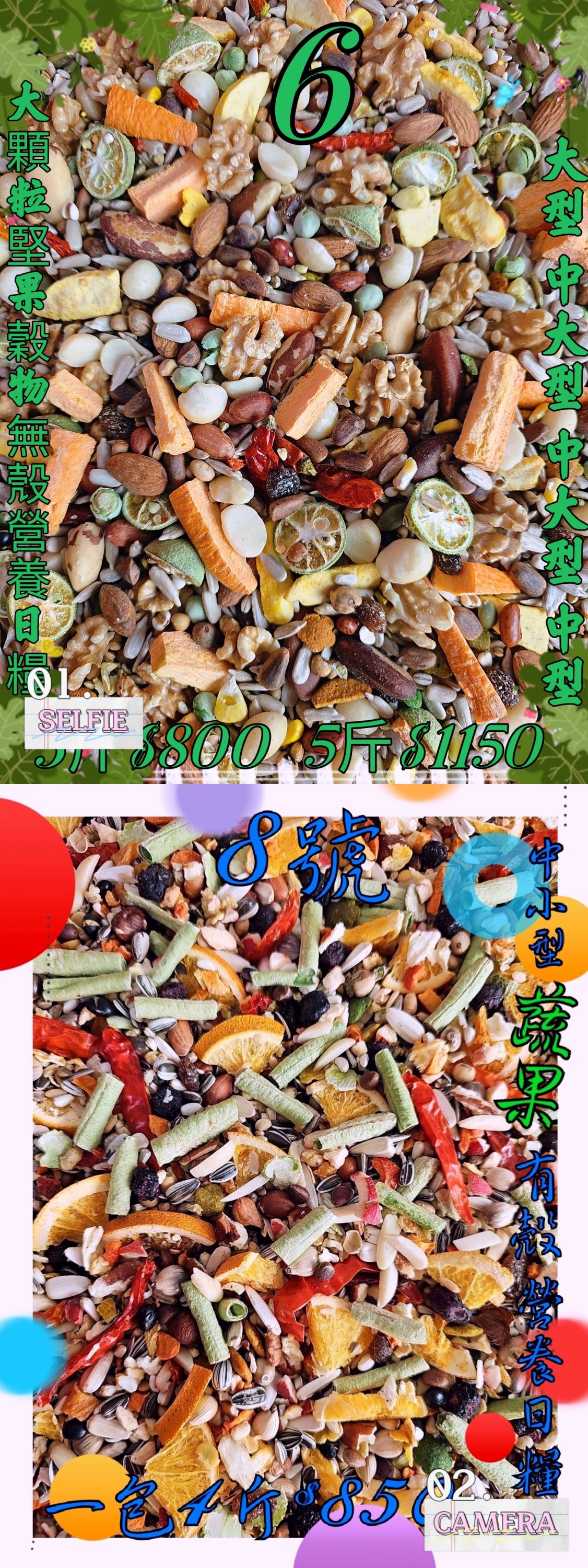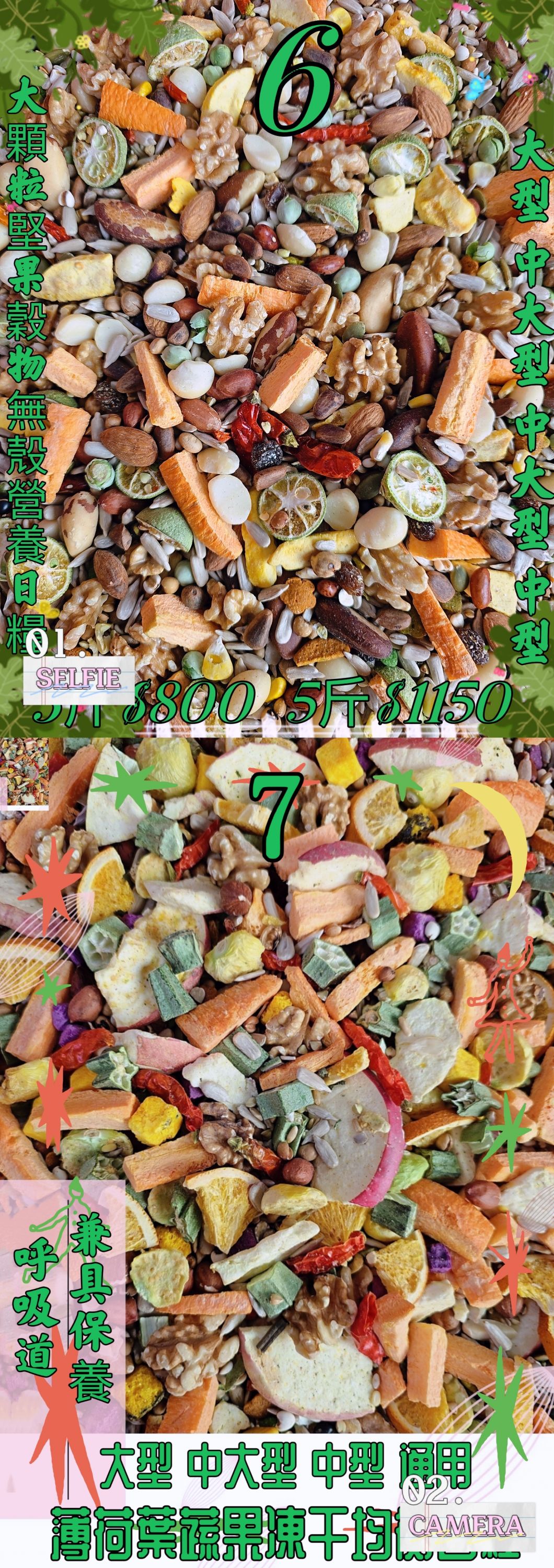 綜合脫殼熟化穀物30幾種、豆類全是爆開使營養更好吸收營養加分(絕沒有高粱.小米.起米.鴿子料🈲️⋯)、高級堅果、(帶殼松子)‘’、巴西堅果、夏威夷豆、核桃仁、杏仁果、野山椒🌶、葡萄乾、紅蘿蔔凍甘條、玉米凍干、青豆凍干、滋養丸、芒果凍干塊、高級青桔凍干…等等🏆 ((也會隨著季節做更新調配))