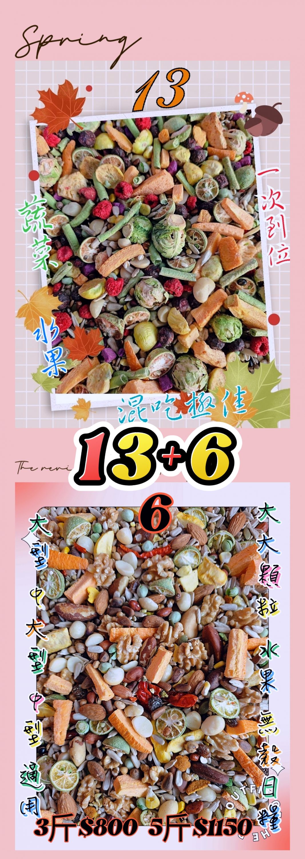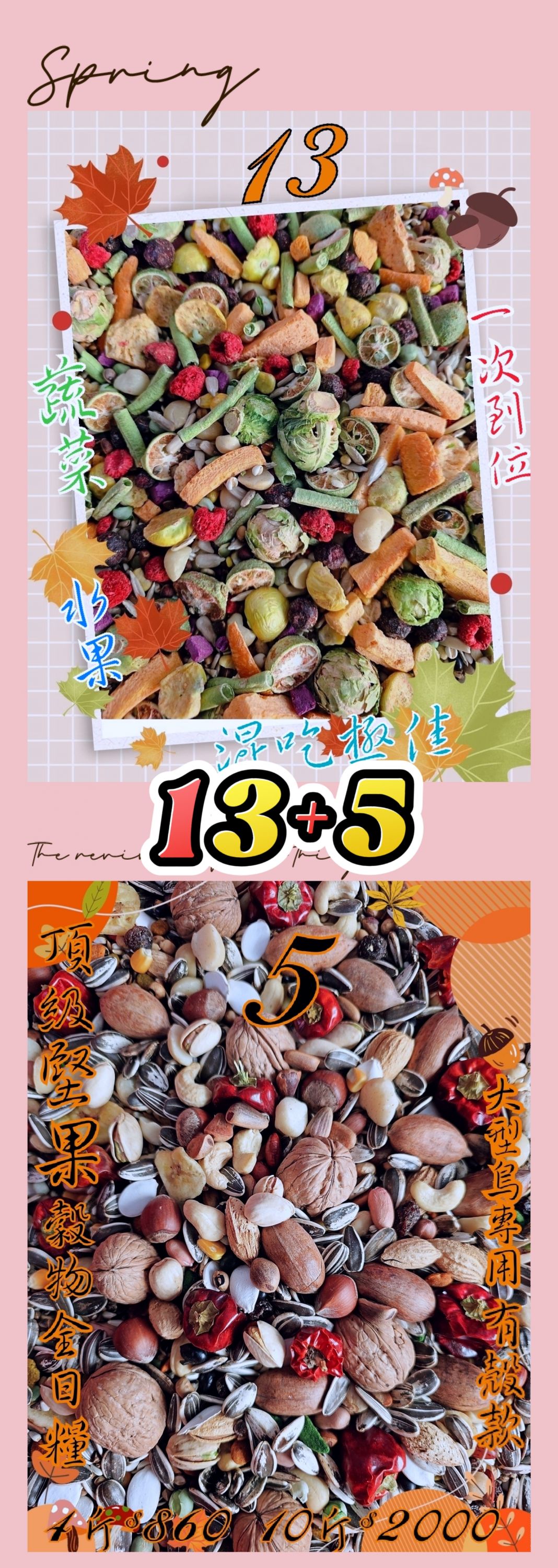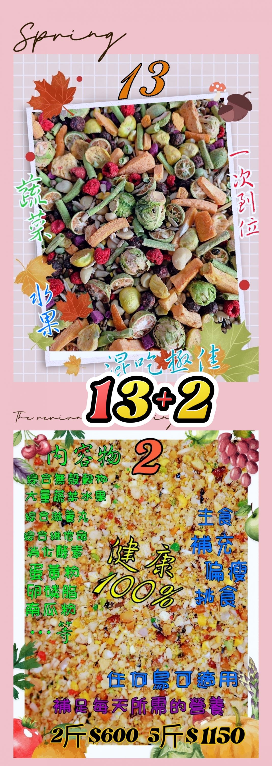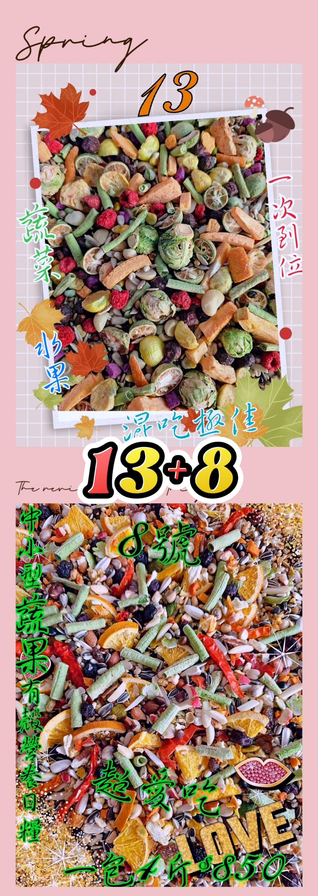 適合:大中小型鸚鵡、大型金剛科、巴丹科、折衷、灰鸚、亞馬遜科、如:凱克、塞内、月輪、賈丁、红肩金剛、金太陽、小太陽、和尚、锥尾中小型的相關科通用⋯⋯可補足營養全方位缺乏營養不良的食物、(採用食品级原料)。🈚️不添加防腐劑、🈚️不加化學原料、👉鸚鵡吃的很安心、我們不斷創新、不斷變化口味、我們做的用心你們買的安心、鳥吃的安心、吃出健康茁壯~肌肉💪、13號當主食也可以不用在添加任何東西了、一包搞定也可以。或是也可添加其它無殼料會更加豐富、鳥寶更多選擇⋯健康加分