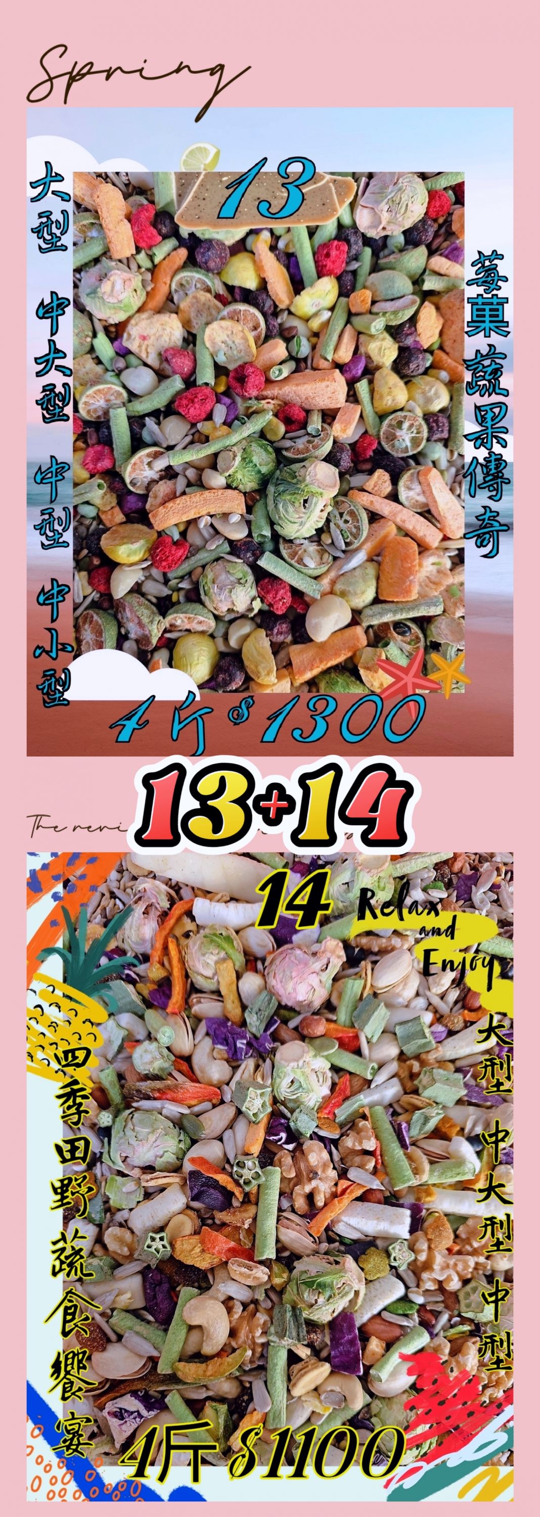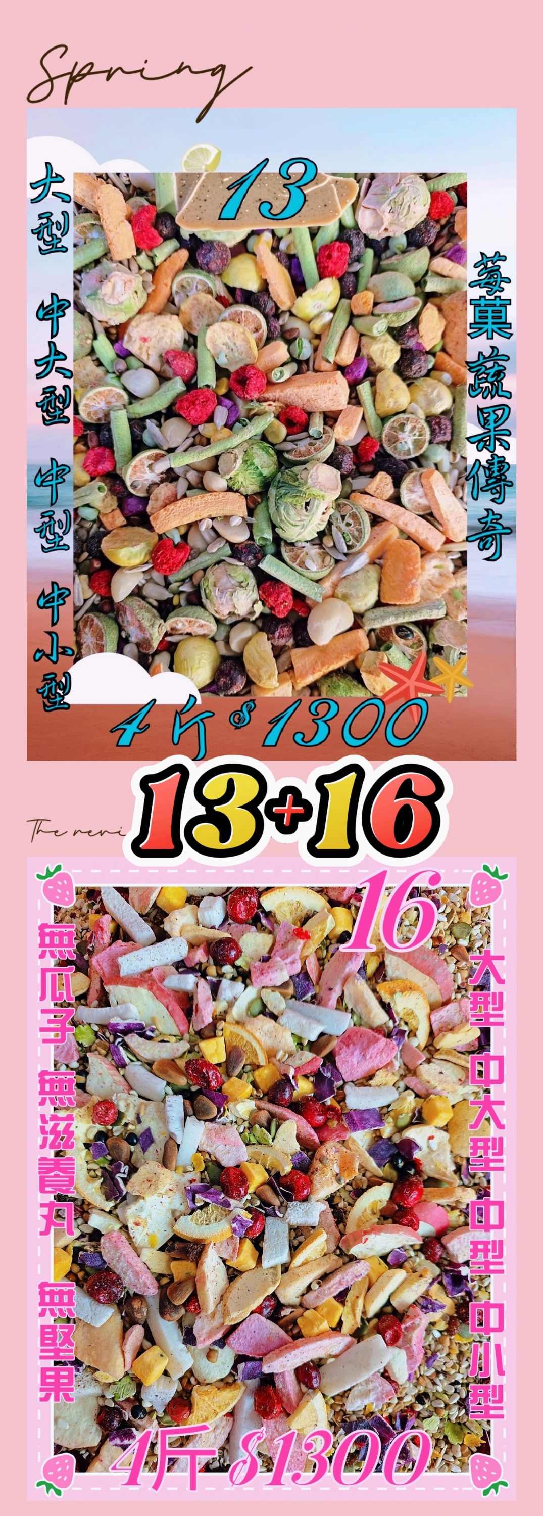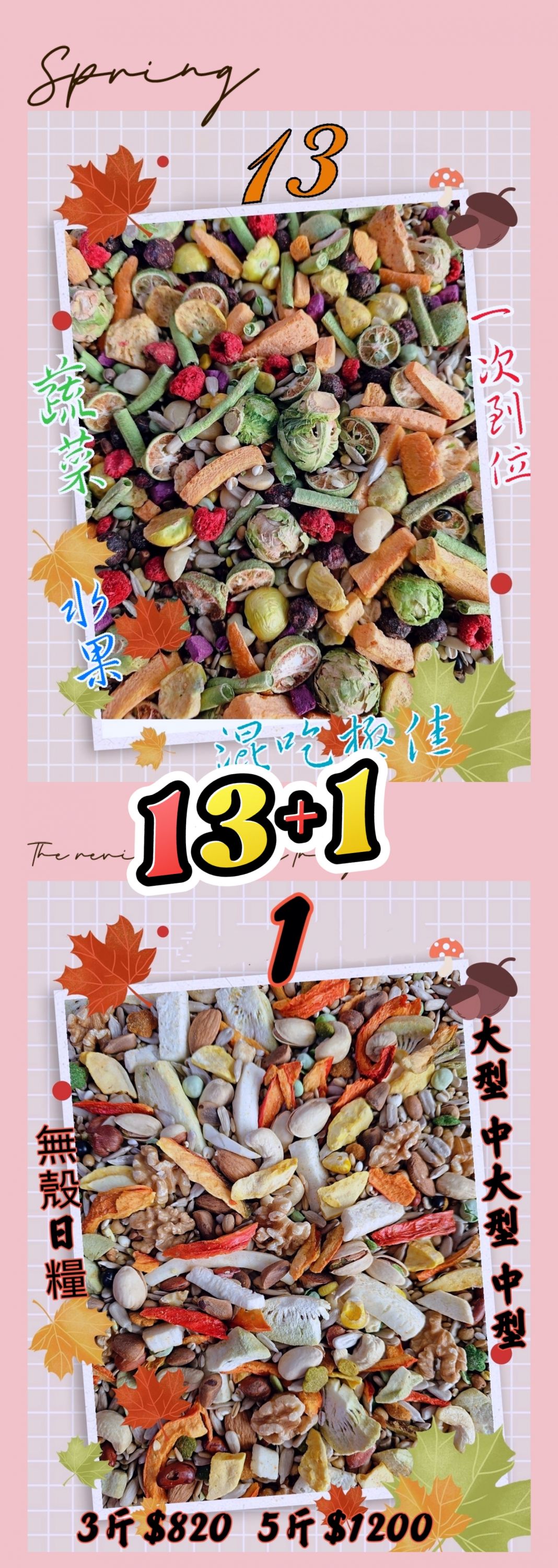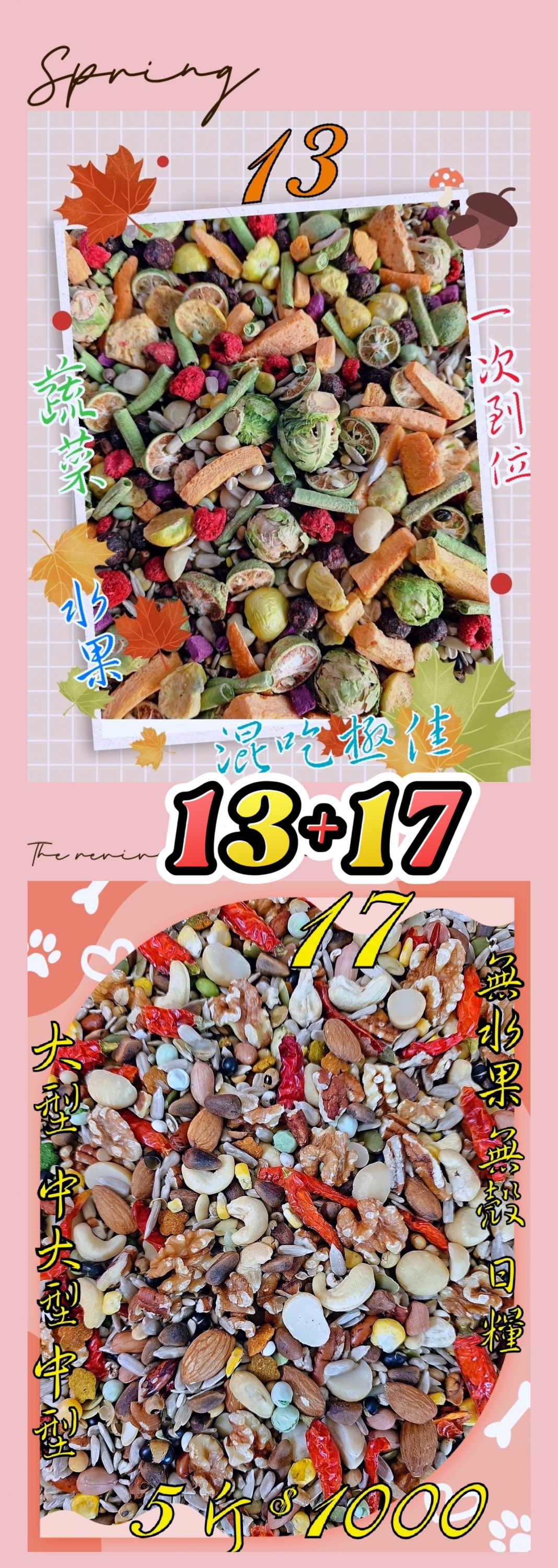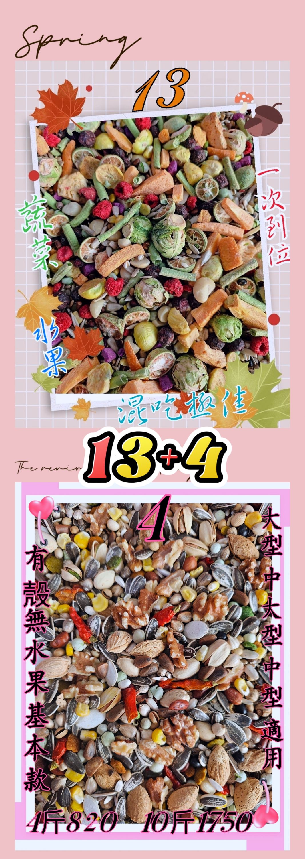 適合:大中小型鸚鵡、大型金剛科、巴丹科、折衷、灰鸚、亞馬遜科、如:凱克、塞内、月輪、賈丁、红肩金剛、金太陽、小太陽、和尚、锥尾中小型的相關科通用⋯⋯可補足營養全方位缺乏營養不良的食物、(採用食品级原料)。🈚️不添加防腐劑、🈚️不加化學原料、👉鸚鵡吃的很安心、我們不斷創新、不斷變化口味、我們做的用心你們買的安心、鳥吃的安心、吃出健康茁壯~肌肉💪、13號當主食也可以不用在添加任何東西了、一包搞定也可以。或是也可添加其它無殼料會更加豐富、鳥寶更多選擇⋯健康加分