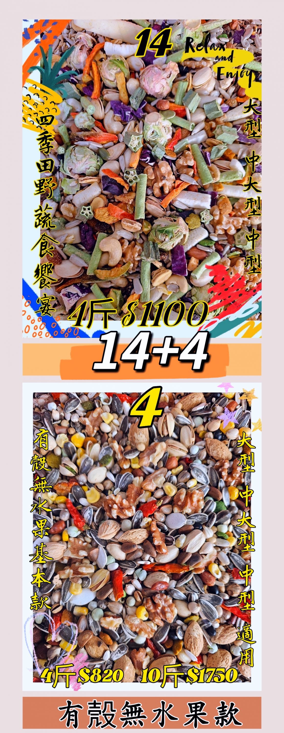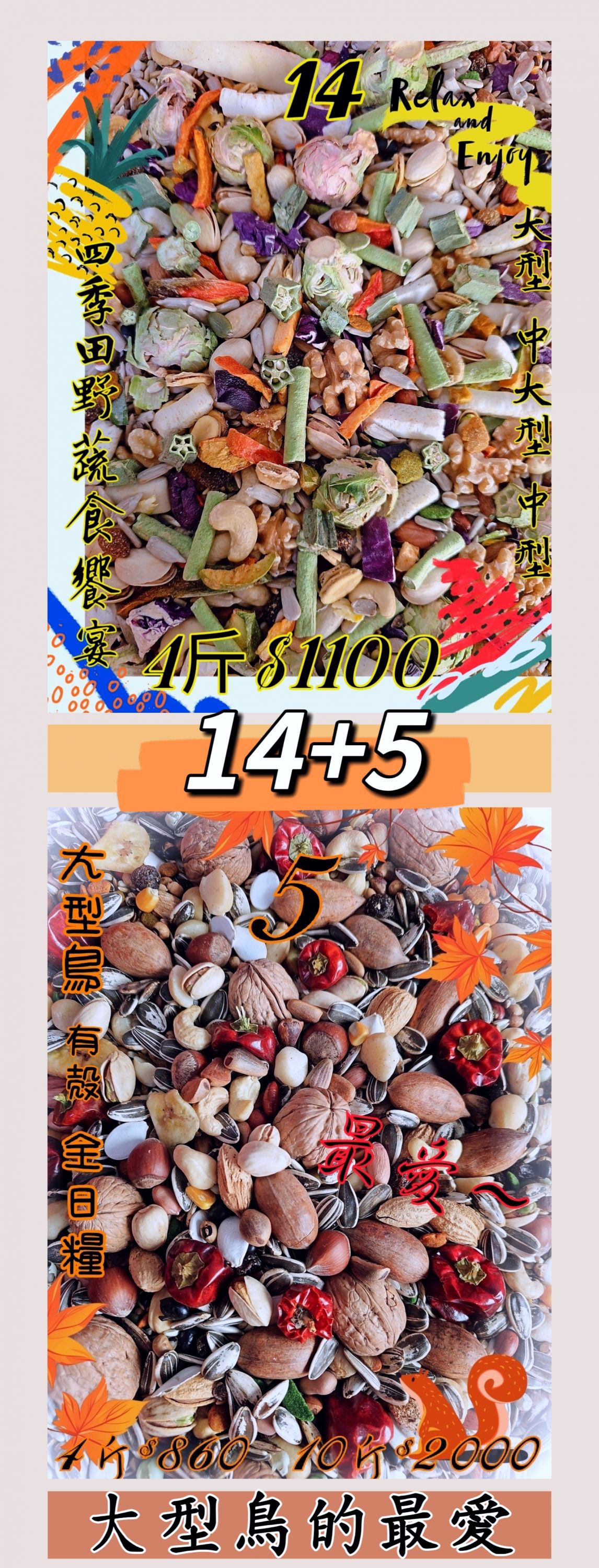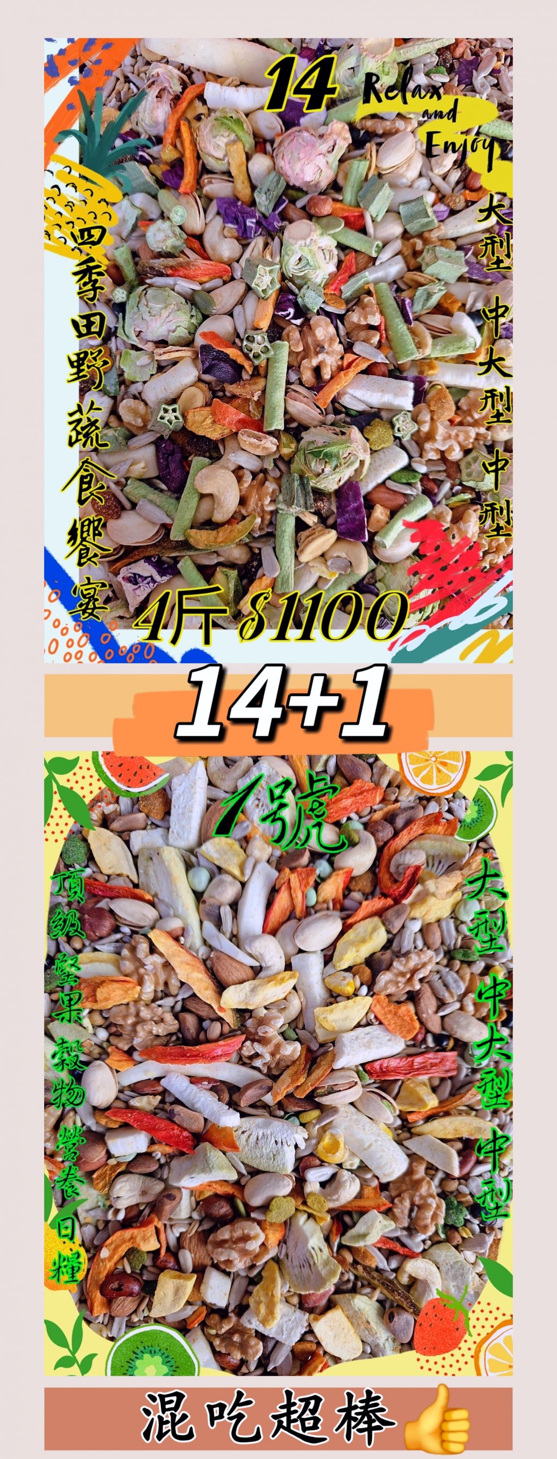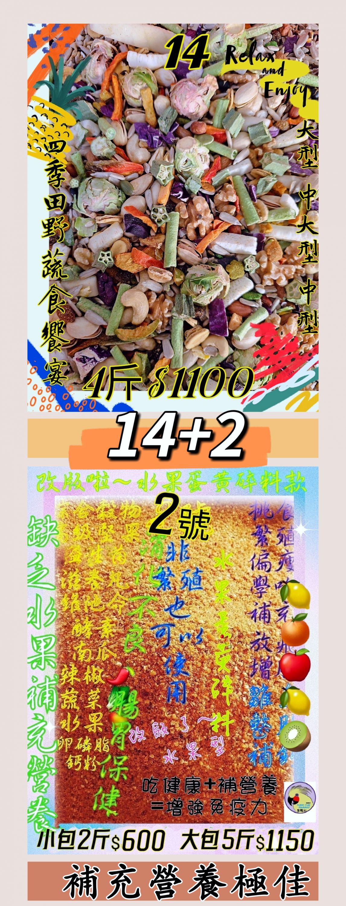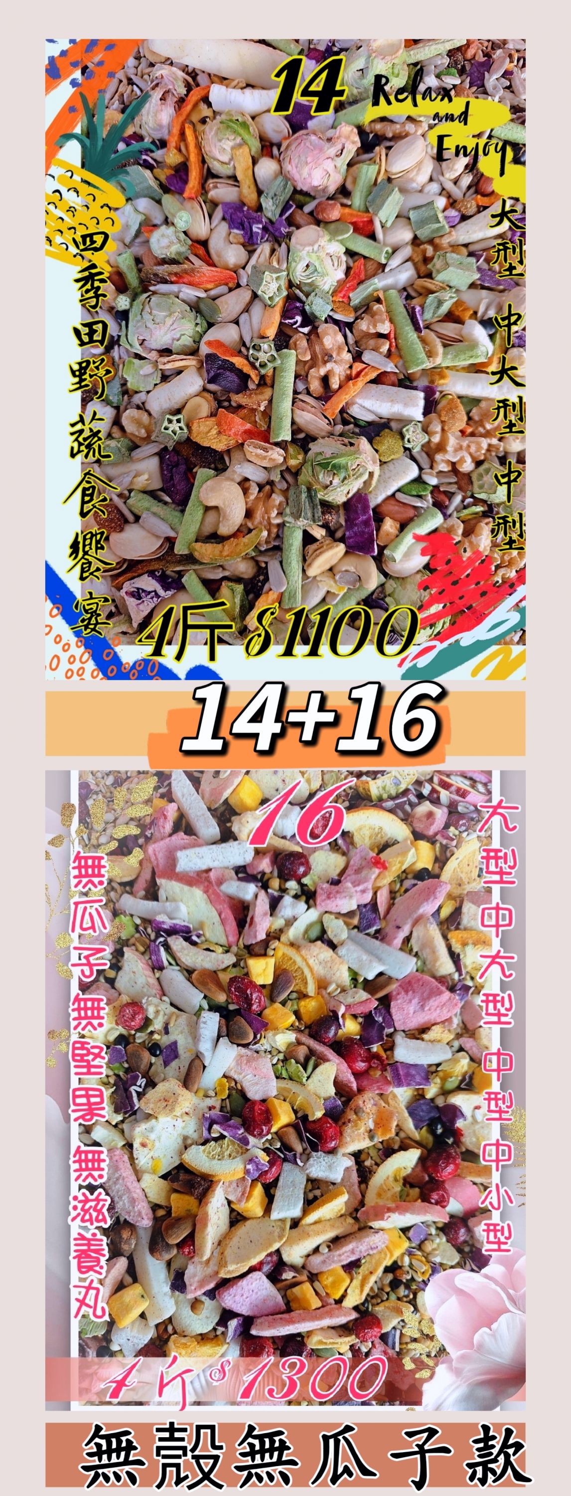 💕貼心小建議~中小型鳥寶若是要更多樣話可以搭配中小型部分(2,10,11,12,7,13,16,)混合吃這些是無殼日糧⋯超👍⏩比較適合中型中小型使用、更加豐富也會多樣化營養。