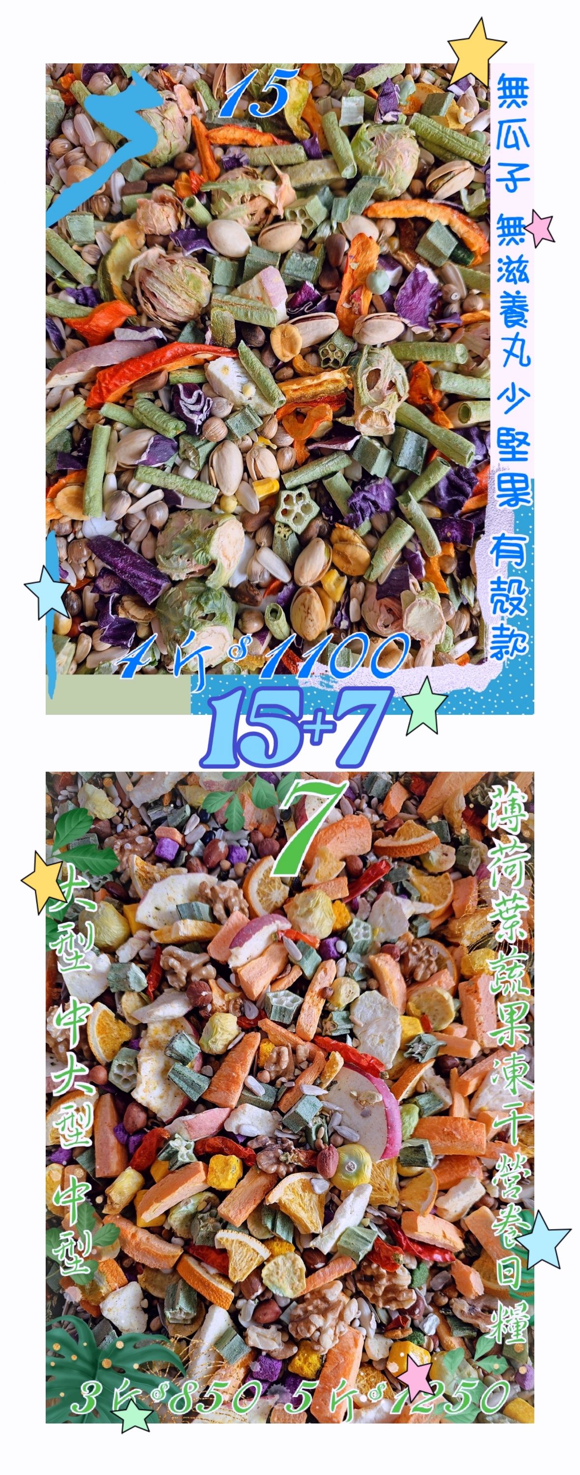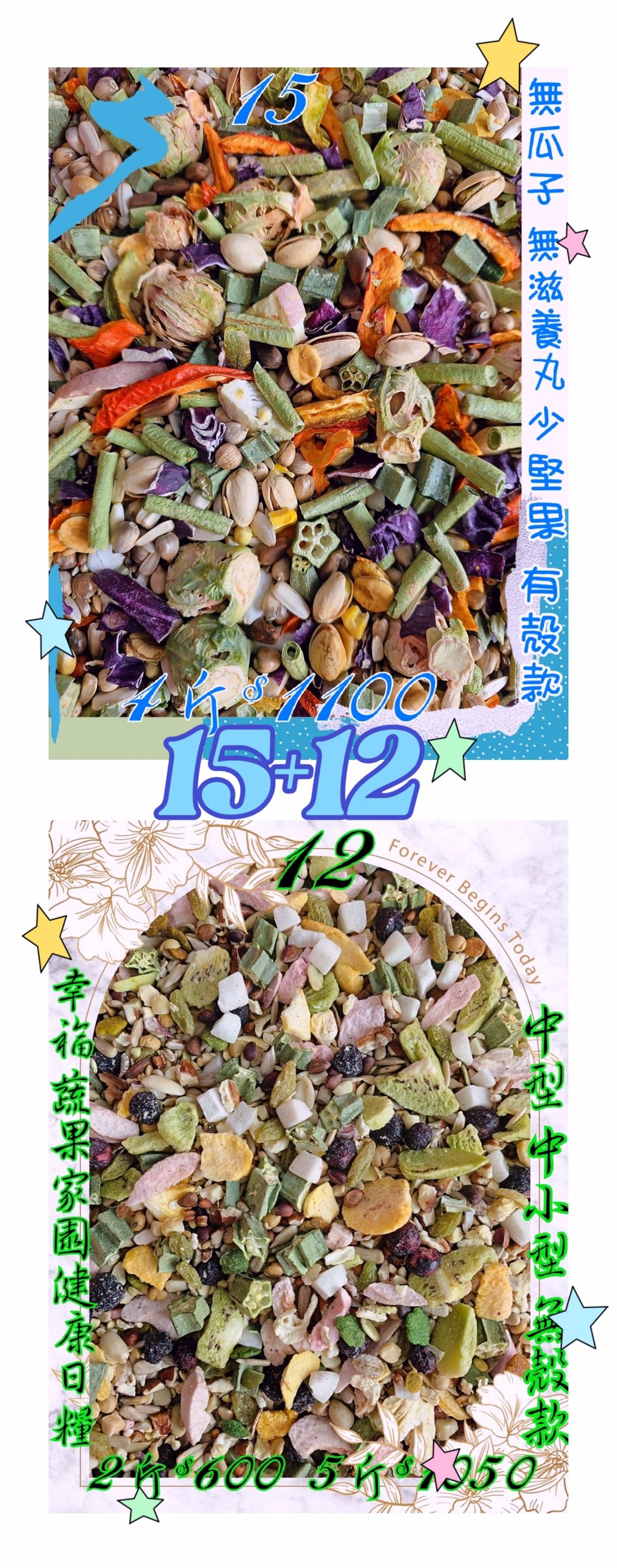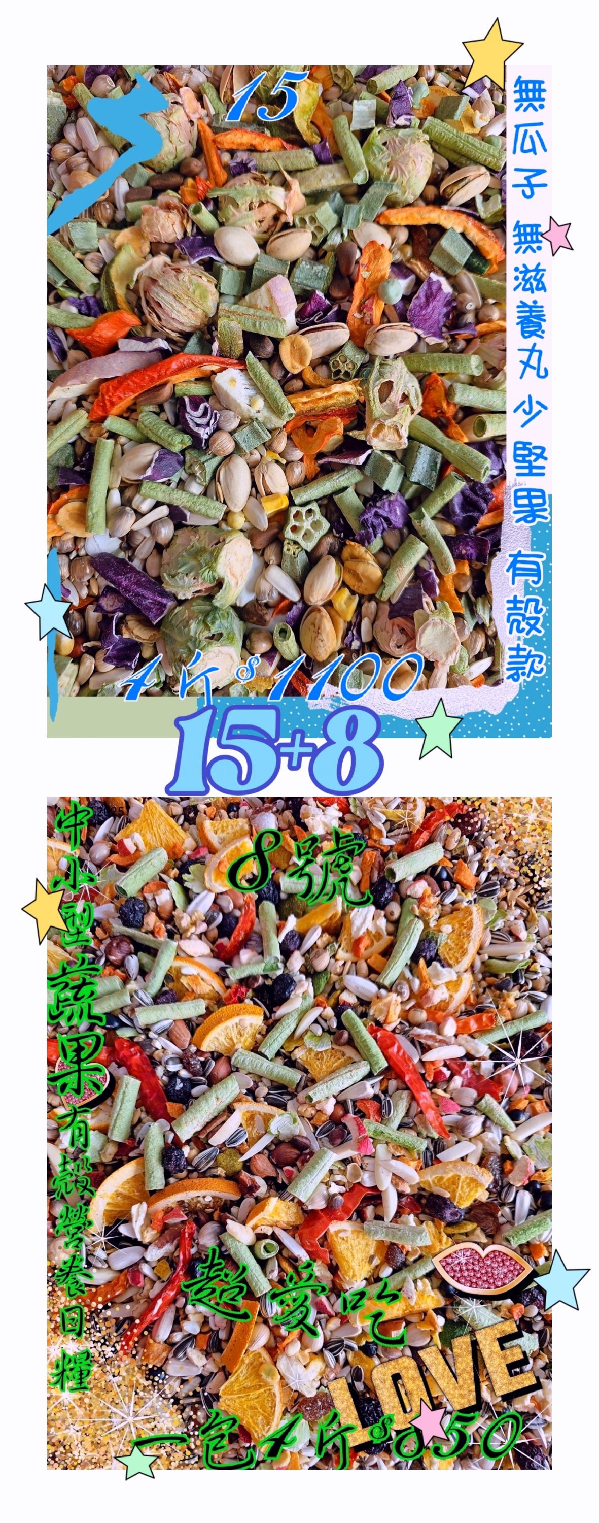 15號:大型,中型,中大型鸚鵡更好咬勁、內有許多豐富穀物蔬果凍干都是鸚鵡很喜愛的食物、又可以幫助咬合力,完全採用食品級原料。如果想要在更豐富又均衡營養可以搭賣場有殼食用(4.5.8.9.),這幾款都是有殼日糧。可以搭配一起混15號吃、營養加分+效果極佳+鸚鵡超愛⋯嗜口性超棒~鸚鵡超愛咬的咔ㄗ咔ㄗ的唷!健康百分百