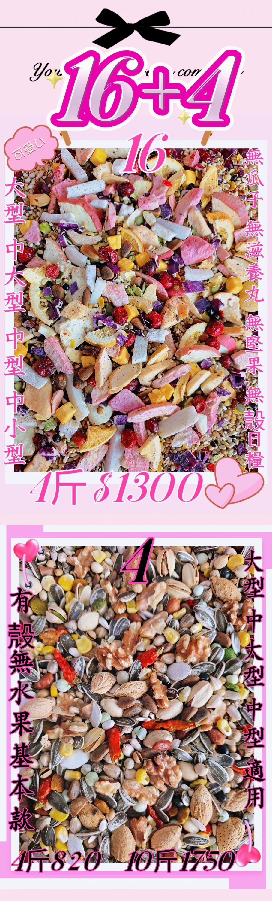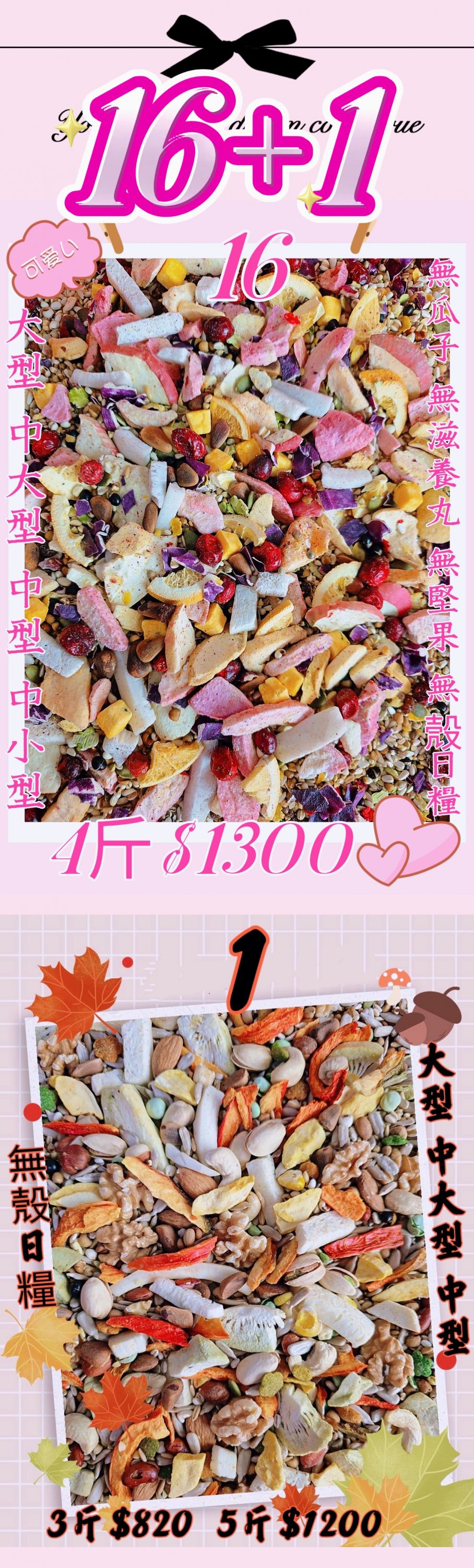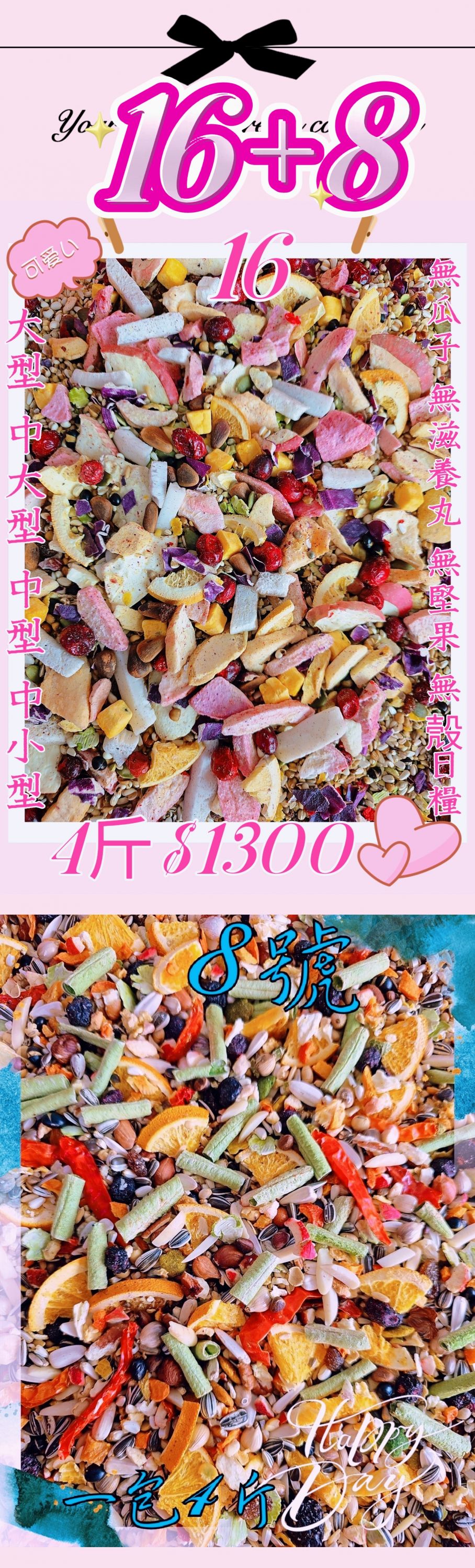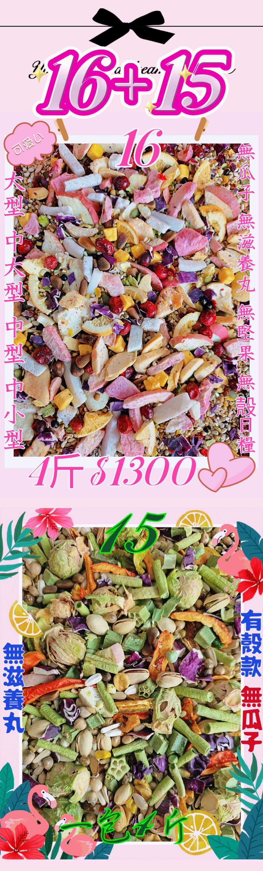 16號:中型,中大型鸚鵡更好咬勁、內有許多豐富穀物蔬果凍干都是鸚鵡很喜愛的食物、又可以幫助咬合力,完全採用食品級原料。如果想要在更豐富又均衡營養可以搭賣場無殼混吃(1.2.3.6.7.10.11.12.13.14.17)以上都是可以搭配16號混吃,這幾款都是剝殼日糧。可以搭配一起混吃、營養加分+效果絕佳+鸚鵡超愛⋯嗜口性超棒~鸚鵡超愛咬的咔ㄗ咔ㄗ的唷!健康百分百