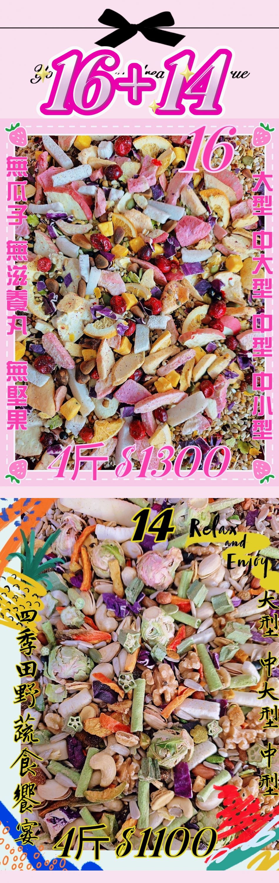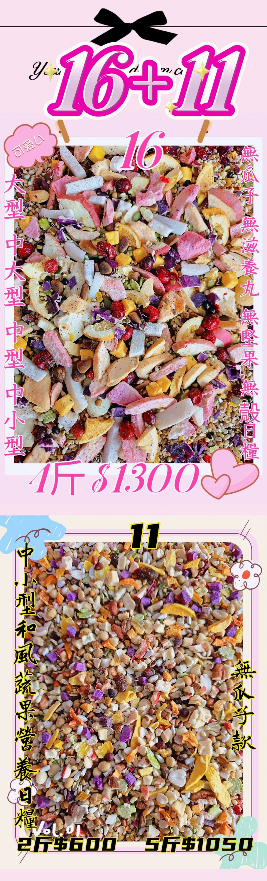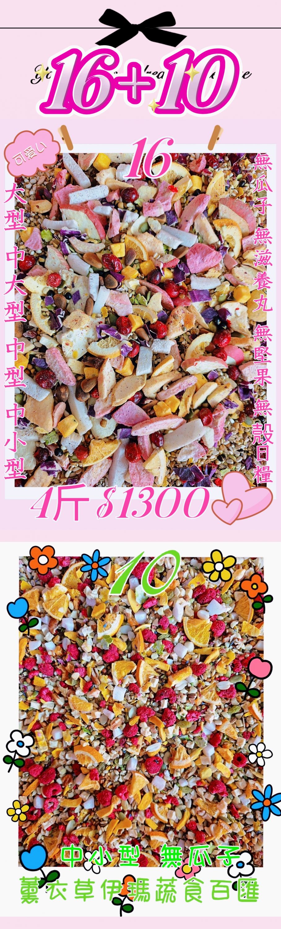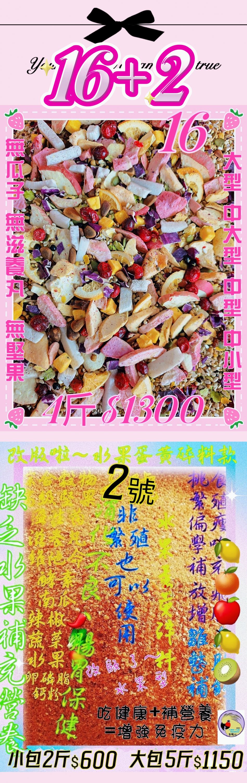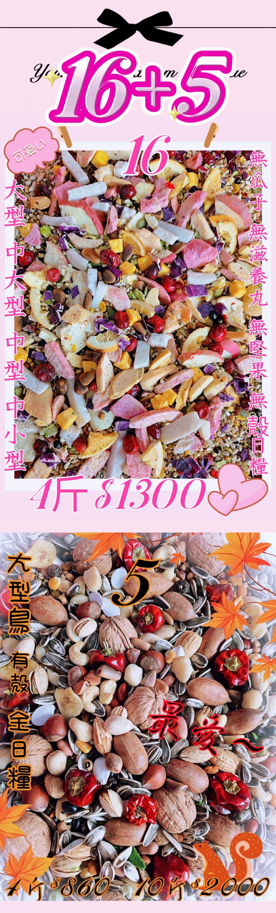 16號:中型,中大型鸚鵡更好咬勁、內有許多豐富穀物蔬果凍干都是鸚鵡很喜愛的食物、又可以幫助咬合力,完全採用食品級原料。如果想要在更豐富又均衡營養可以搭賣場無殼混吃(1.2.3.6.7.10.11.12.13.14.17)以上都是可以搭配16號混吃,這幾款都是剝殼日糧。可以搭配一起混吃、營養加分+效果絕佳+鸚鵡超愛⋯嗜口性超棒~鸚鵡超愛咬的咔ㄗ咔ㄗ的唷!健康百分百