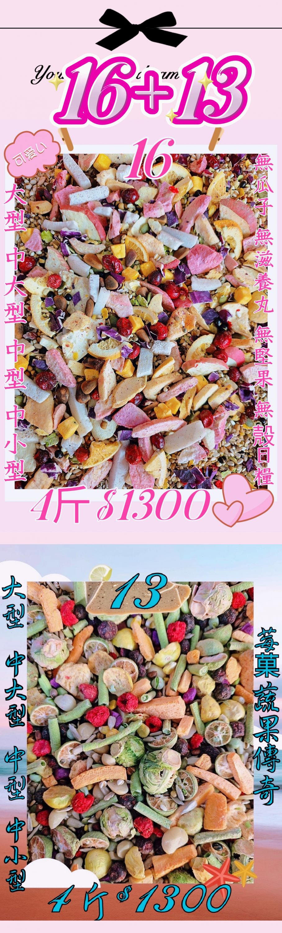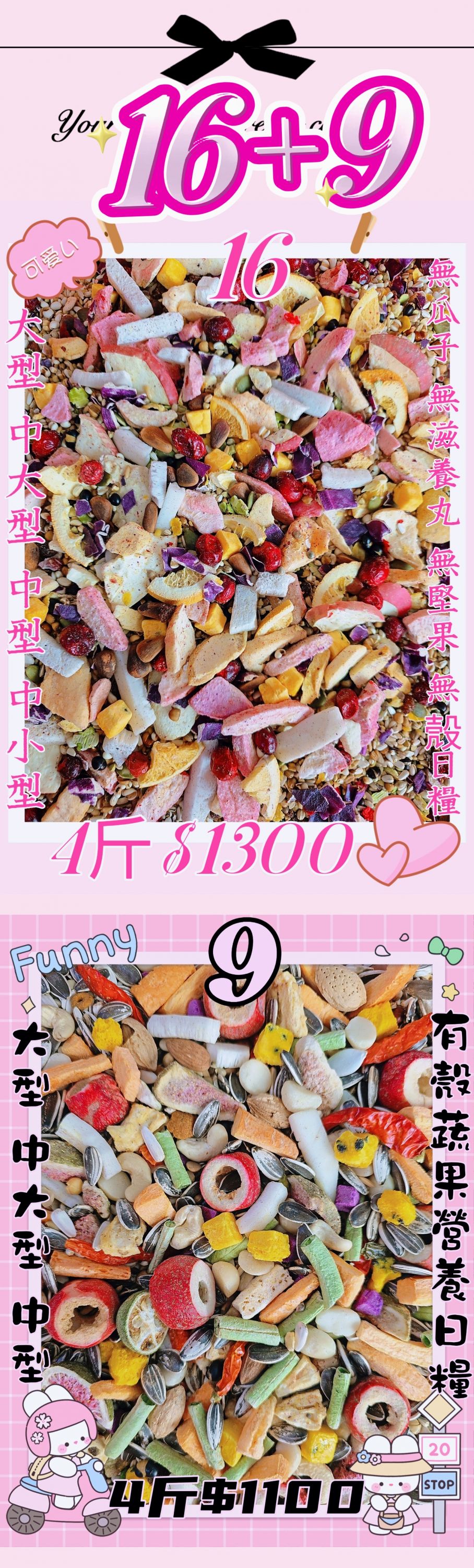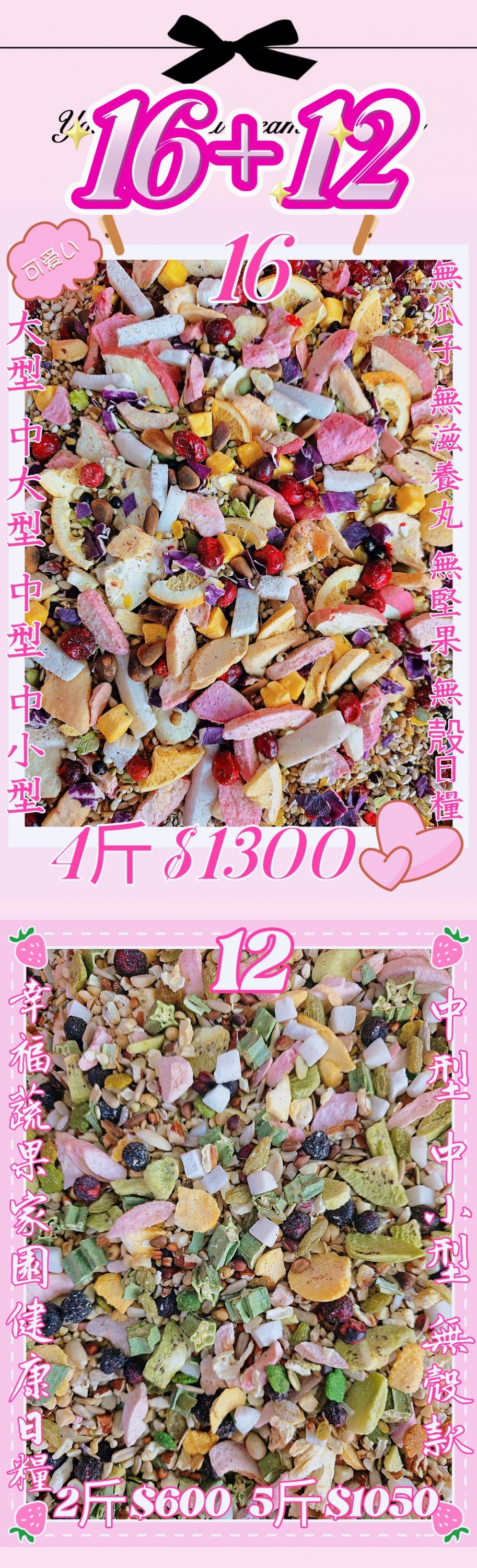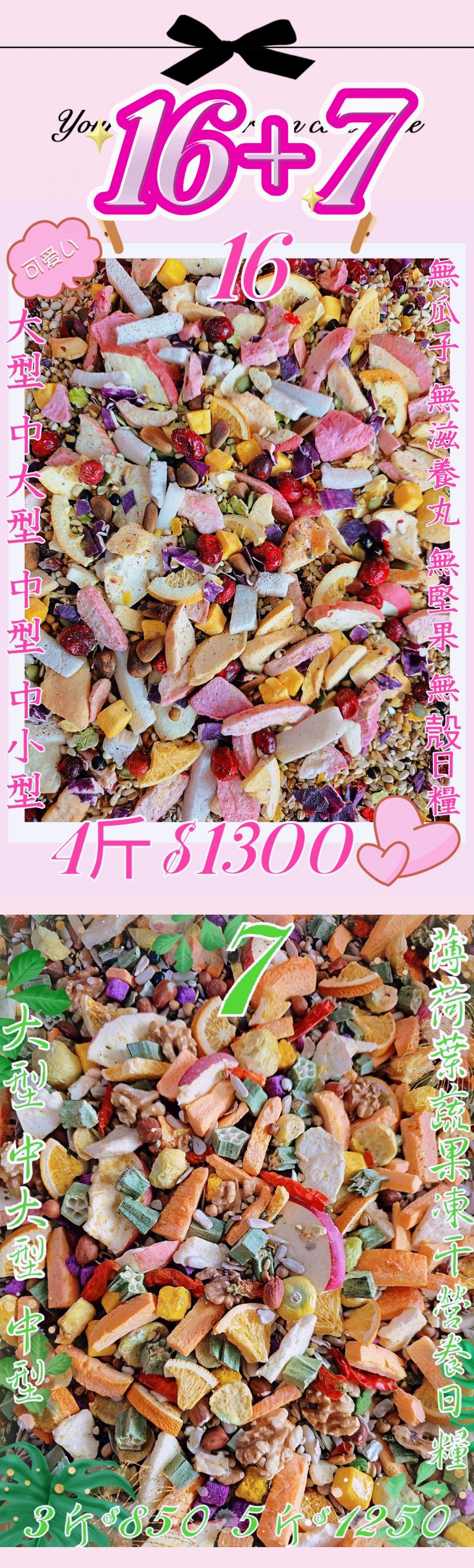 16號:中型,中大型鸚鵡更好咬勁、內有許多豐富穀物蔬果凍干都是鸚鵡很喜愛的食物、又可以幫助咬合力,完全採用食品級原料。如果想要在更豐富又均衡營養可以搭賣場無殼混吃(1.2.3.6.7.10.11.12.13.14.17)以上都是可以搭配16號混吃,這幾款都是剝殼日糧。可以搭配一起混吃、營養加分+效果絕佳+鸚鵡超愛⋯嗜口性超棒~鸚鵡超愛咬的咔ㄗ咔ㄗ的唷!健康百分百
