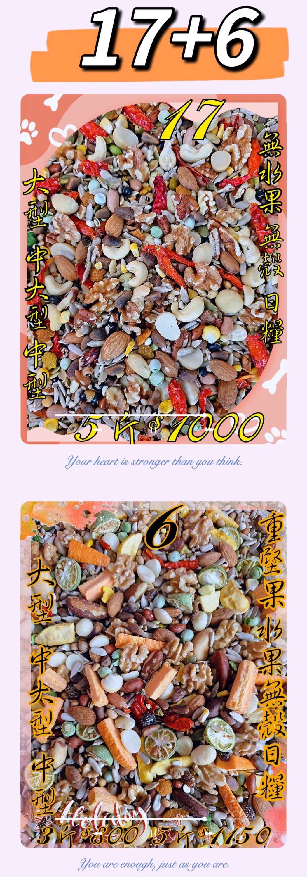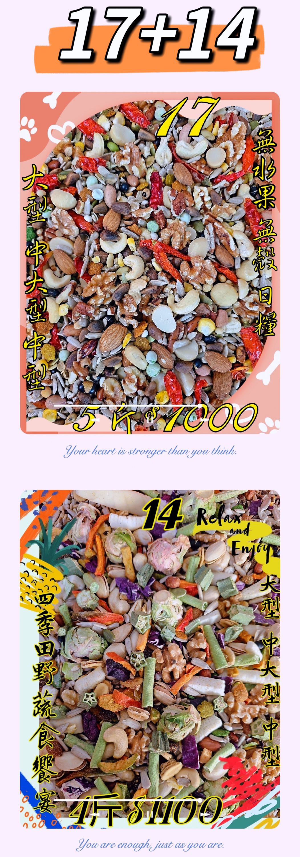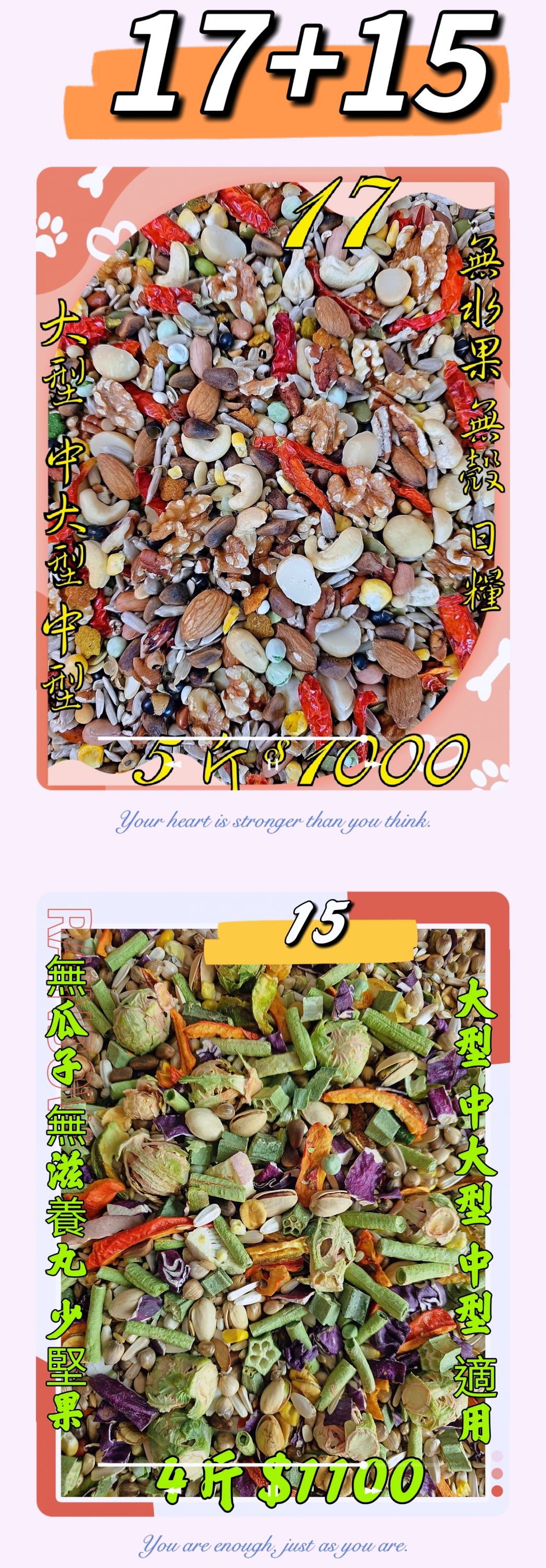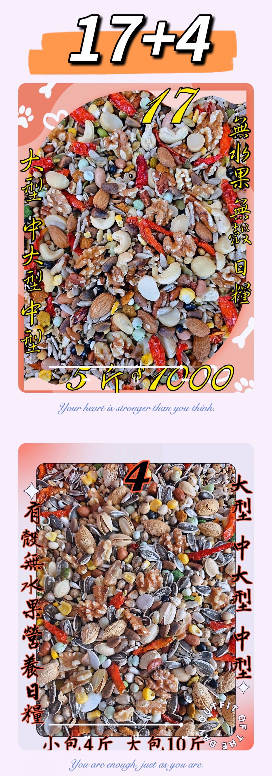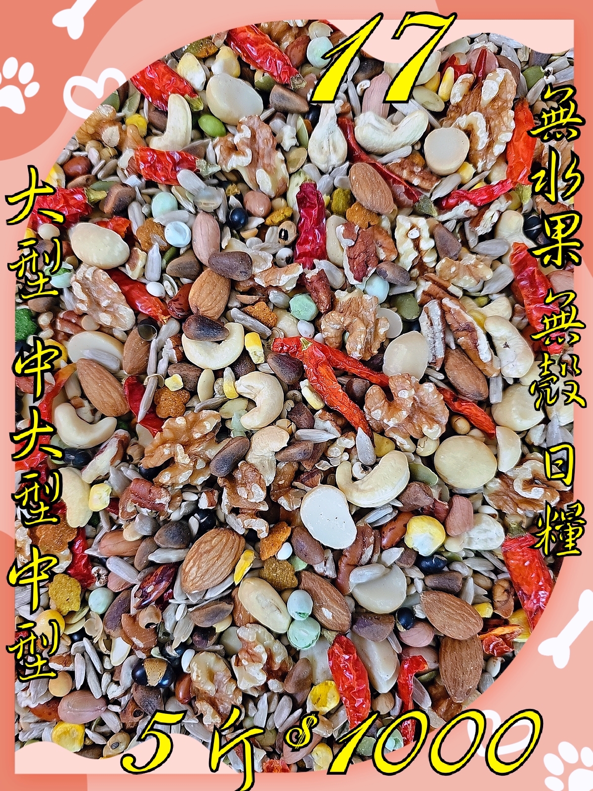 👉(17號)可以不愛吃蔬菜水果類的鳥寶使用、可以給喜愛堅果的鳥寶首選,可以選17號⋯裡面(大顆粒居多)適合:大型‘’中大型‘’中型‘’鸚鵡適用唷!