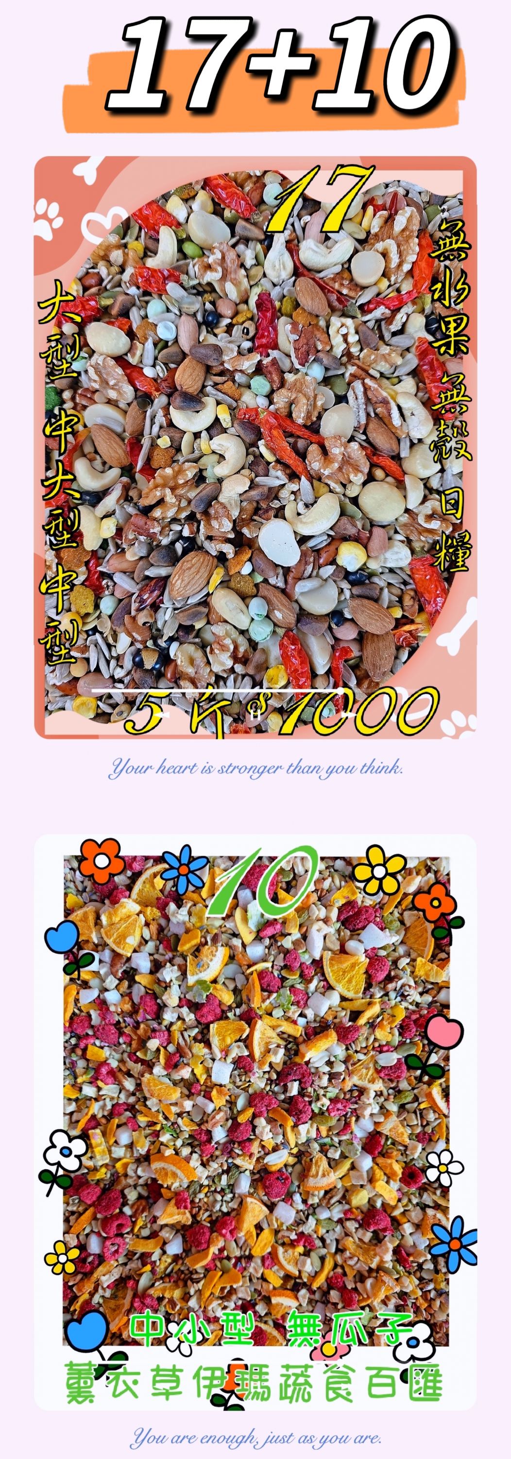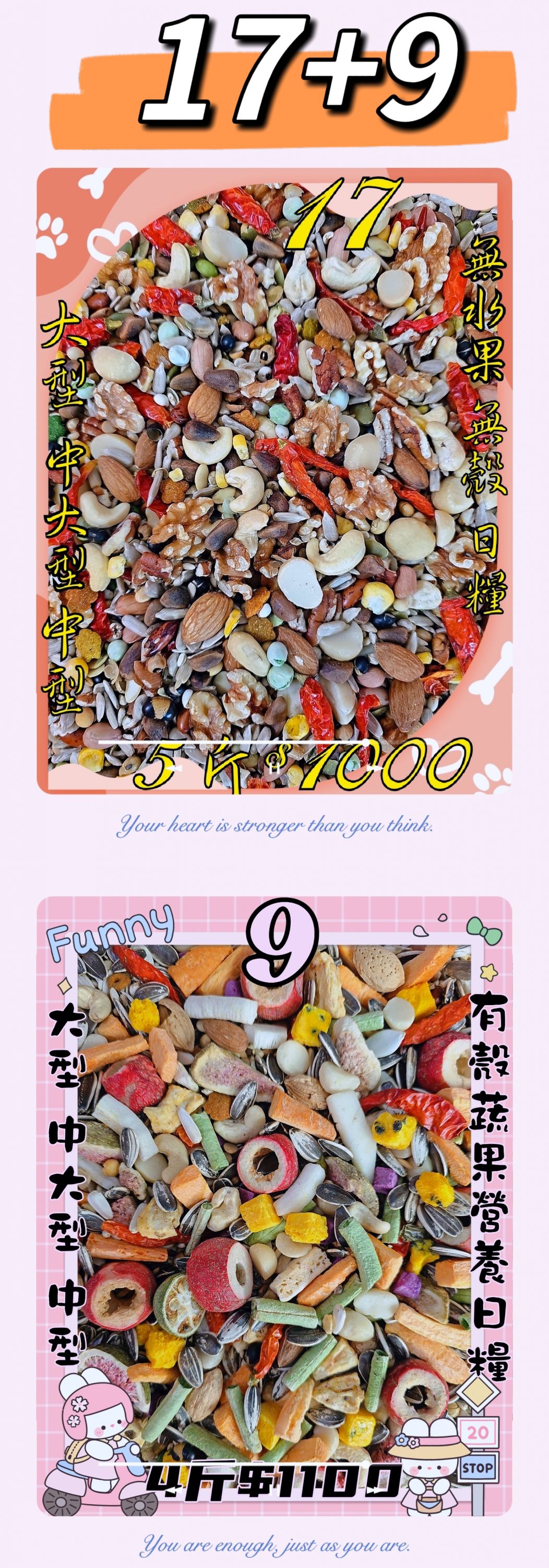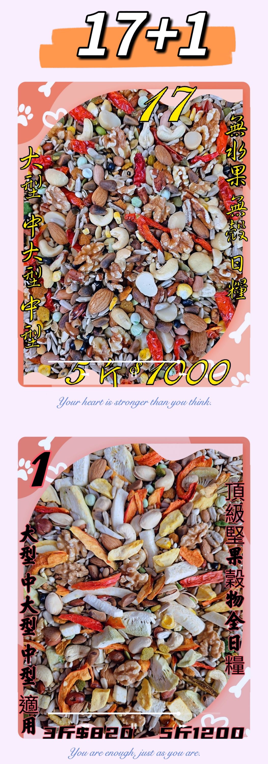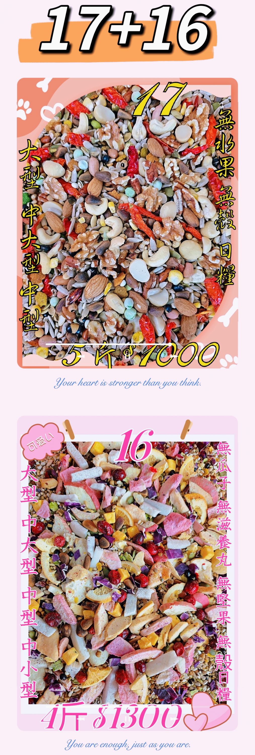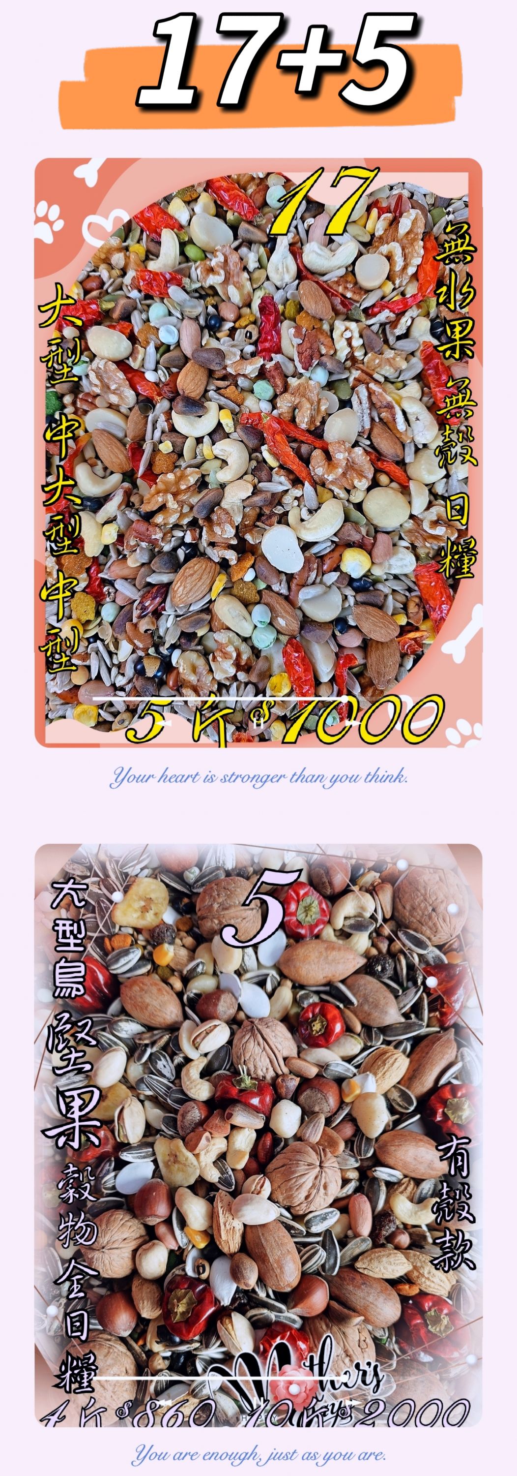 👉(17號)可以不愛吃蔬菜水果類的鳥寶使用、可以給喜愛堅果的鳥寶首選,可以選17號⋯裡面(大顆粒居多)適合:大型‘’中大型‘’中型‘’鸚鵡適用唷!