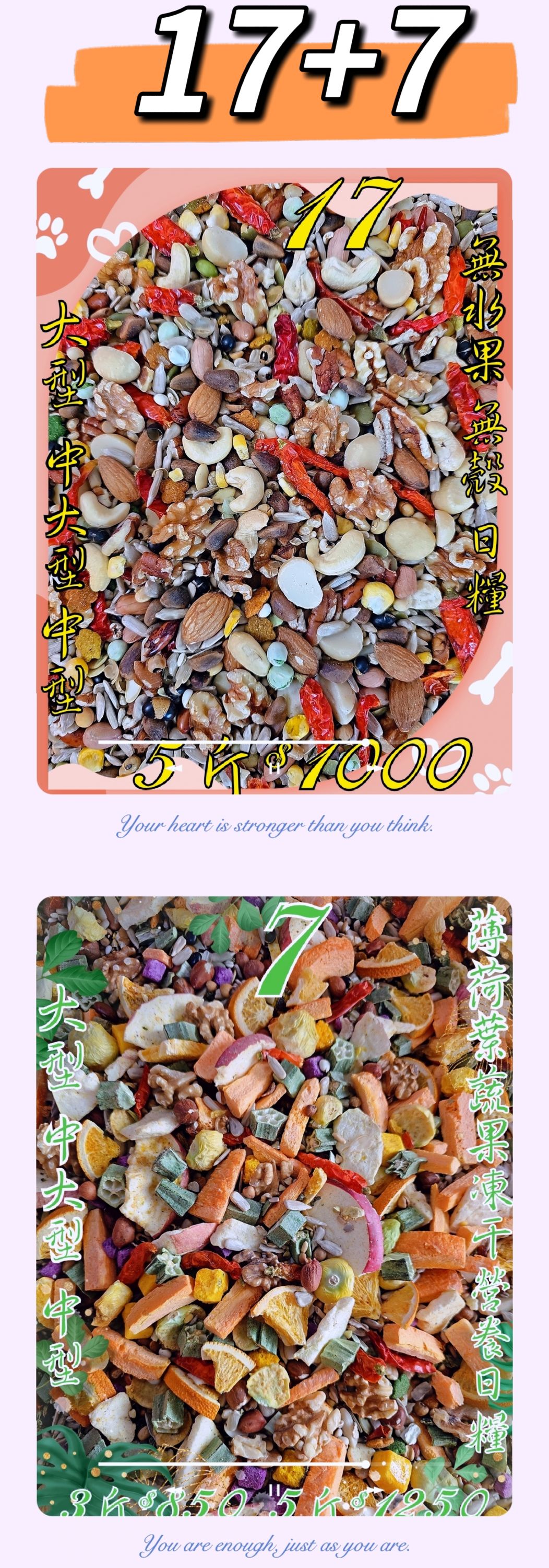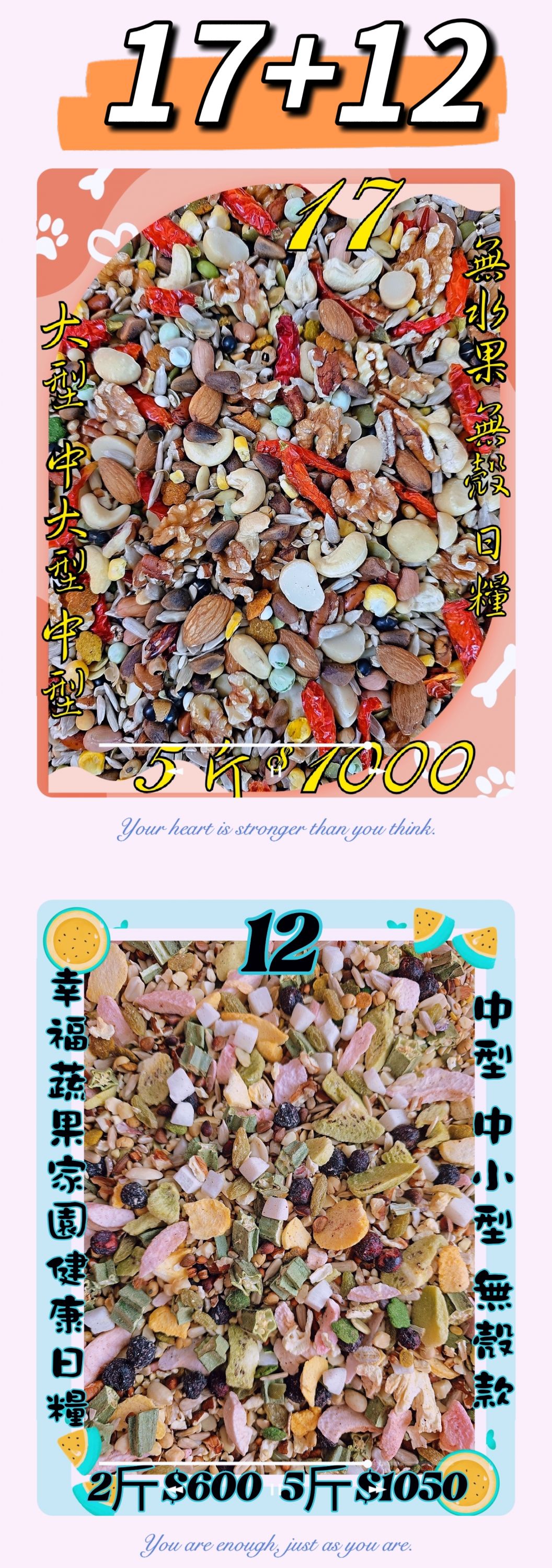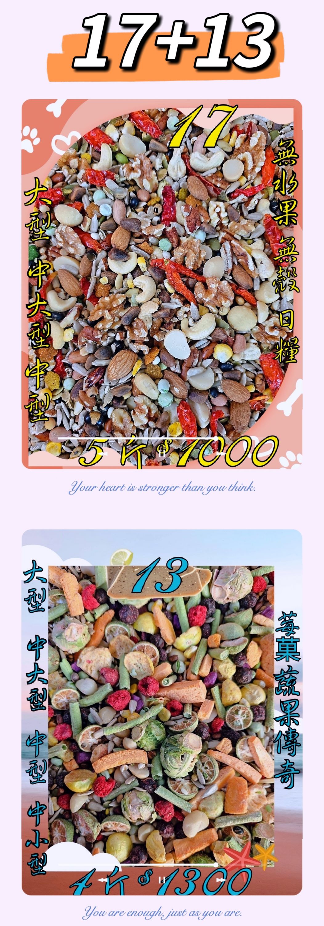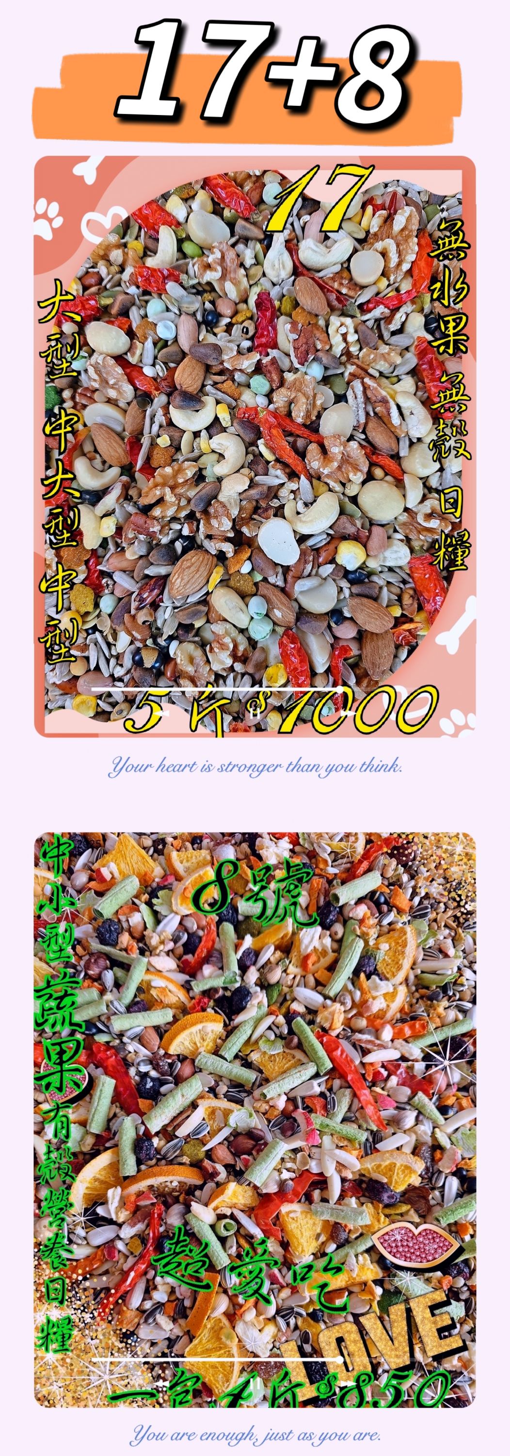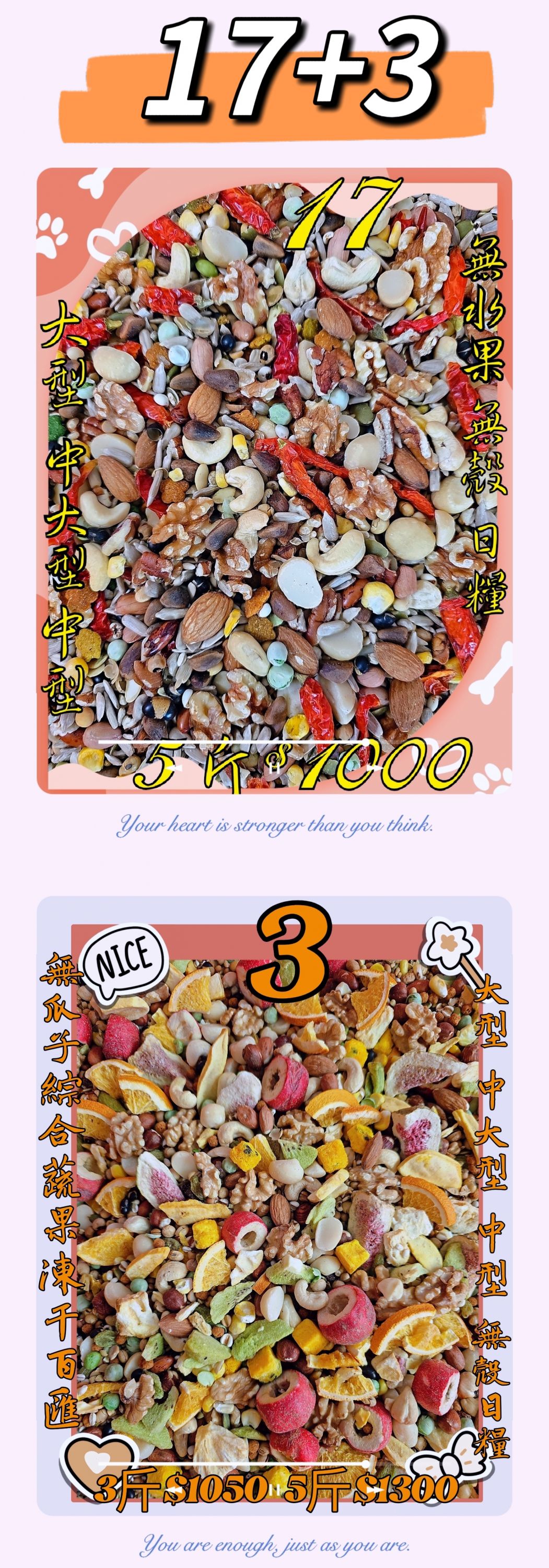👉(17號)可以不愛吃蔬菜水果類的鳥寶使用、可以給喜愛堅果的鳥寶首選,可以選17號⋯裡面(大顆粒居多)適合:大型‘’中大型‘’中型‘’鸚鵡適用唷!